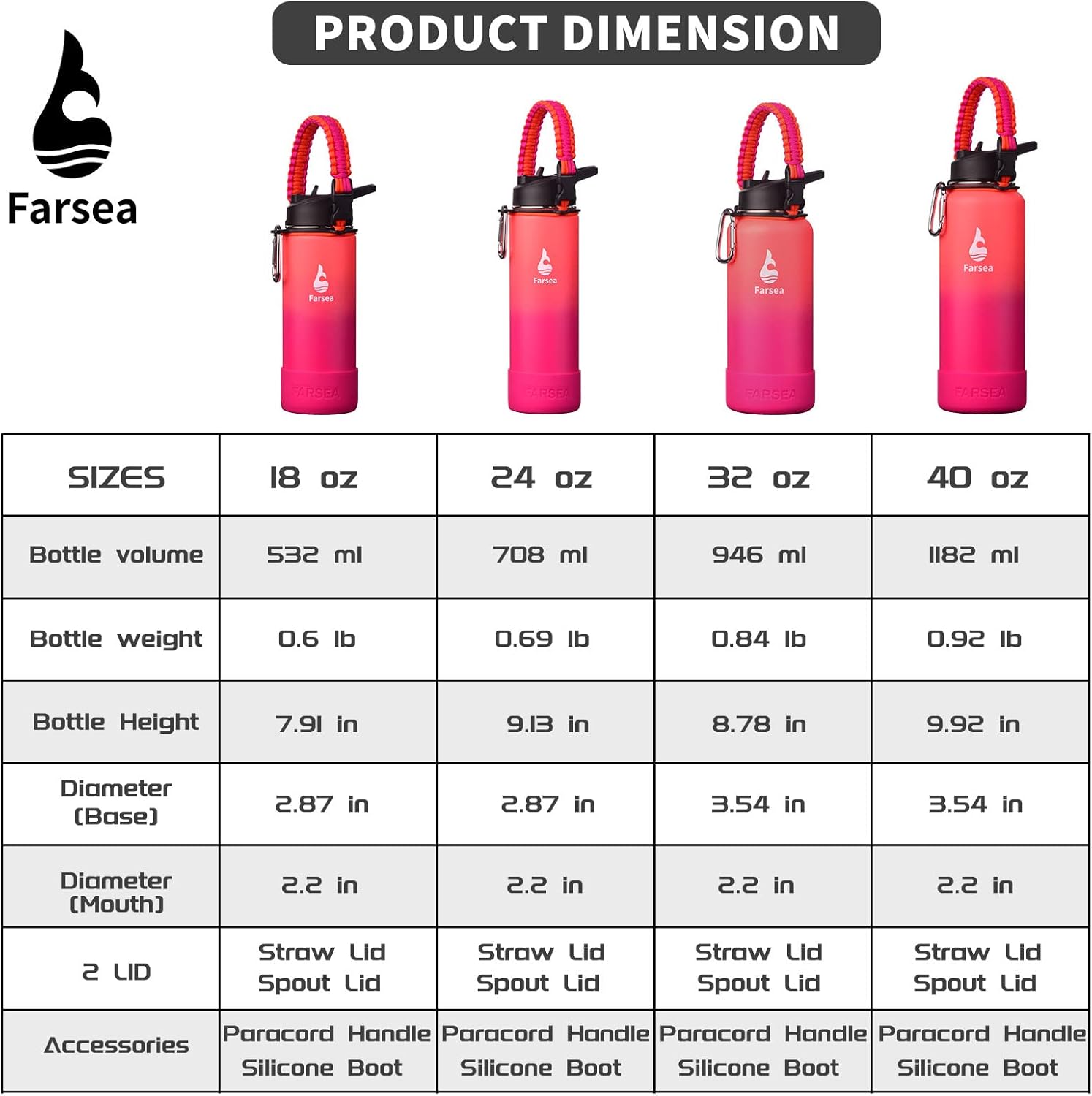 - WHAT YOU'LL GET: Farsea is committed to providing the best value and highest quality to the customers; We offer Continuous After-sales Service and Solve All Problems; We offer several different capacity bottles(12 oz, 18oz, 24 oz, 32 oz, 40oz) and you can choose according to your needs; Package: Comes with 2 lids (Straw lid & Spout Lid), paracord holder, protective Silicone Boot, nice packing box, 2 straws, and straw brush