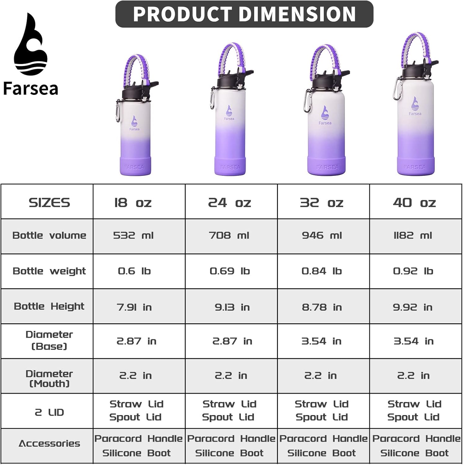 - WHAT YOU'LL GET: Farsea is committed to providing the best value and highest quality to the customers; We offer Continuous After-sales Service and Solve All Problems; We offer several different capacity bottles(12 oz, 18oz, 24 oz, 32 oz, 40oz) and you can choose according to your needs; Package: Comes with 2 lids (Straw lid & Spout Lid), paracord holder, protective Silicone Boot, nice packing box, 2 straws, and straw brush