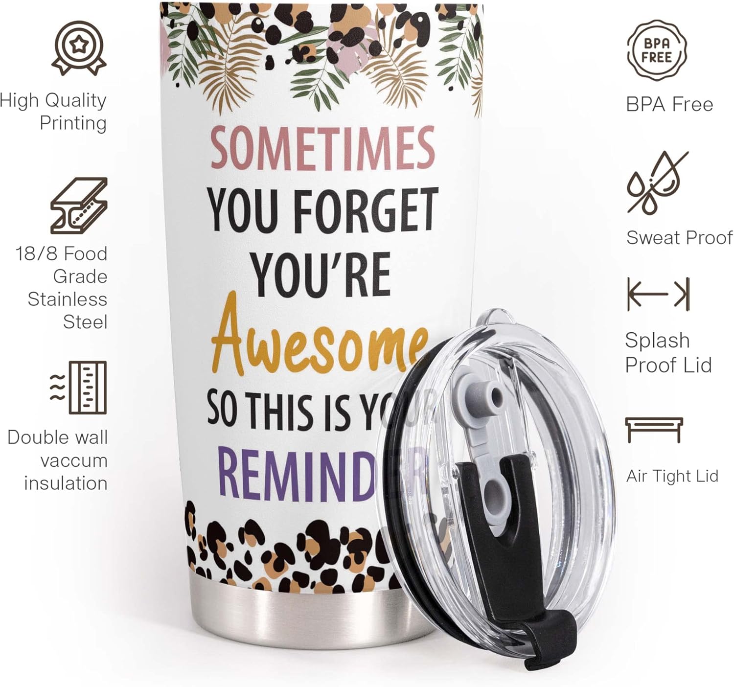 - ๐ PREMIUM MATERIAL - The cup body is made from 18/8 stainless steel, so this tumbler is durable, unbreakable, rust-resistant, and doesn't transfer the flavor of your drinks. The BPA-free clear lid that seals the cup tightly keeps spills under control and allows you to see inside.