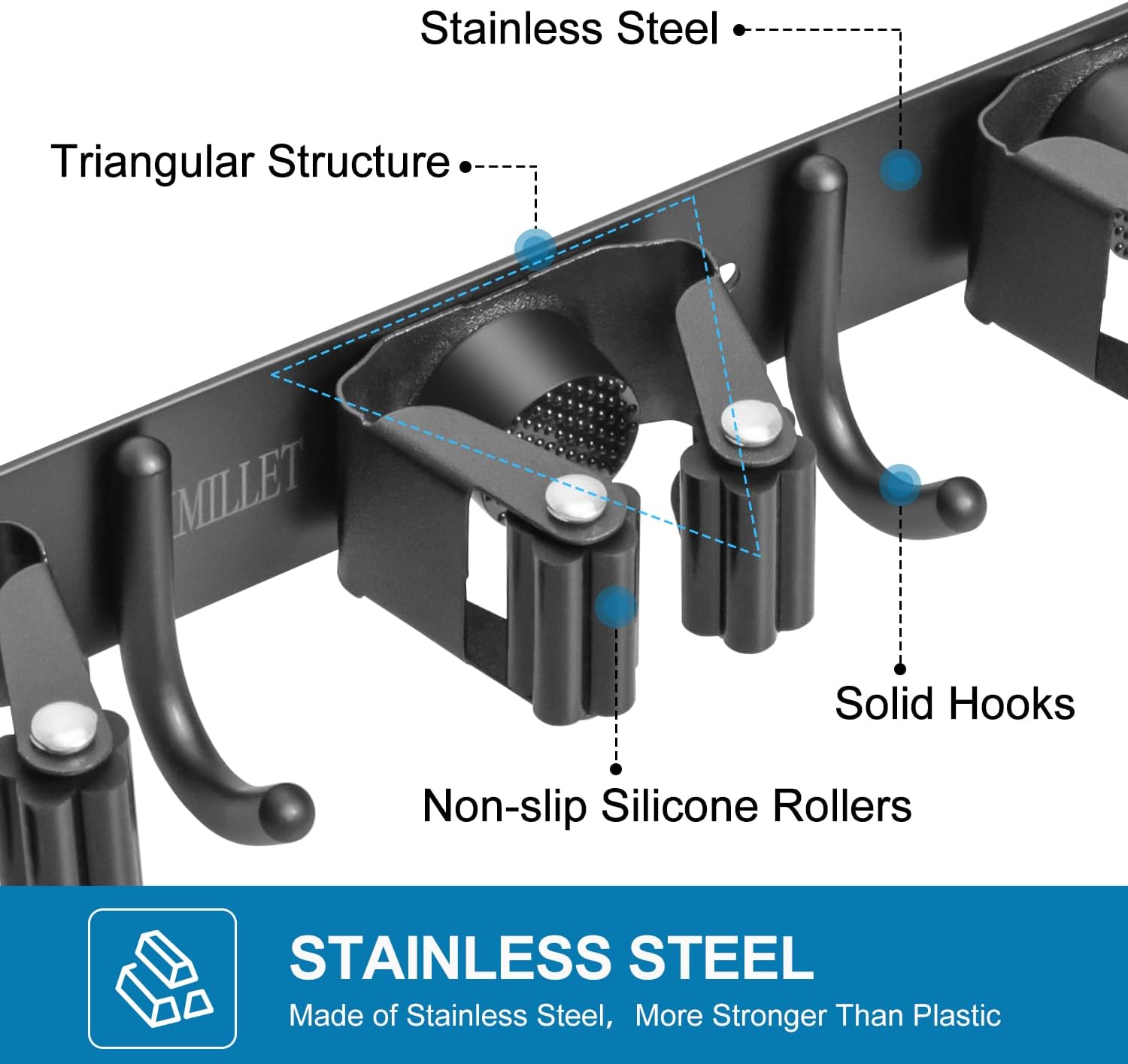 - STRONG & STURDY: Broom and mop wall mount is made of stainless steel, corrosion-resistant, moisture proof and waterproof. Compared with the plastic mop holder, it's more stronger and sturdy. And this broom organizer wall mount can hold up to 200 pounds when mounted it with the screws