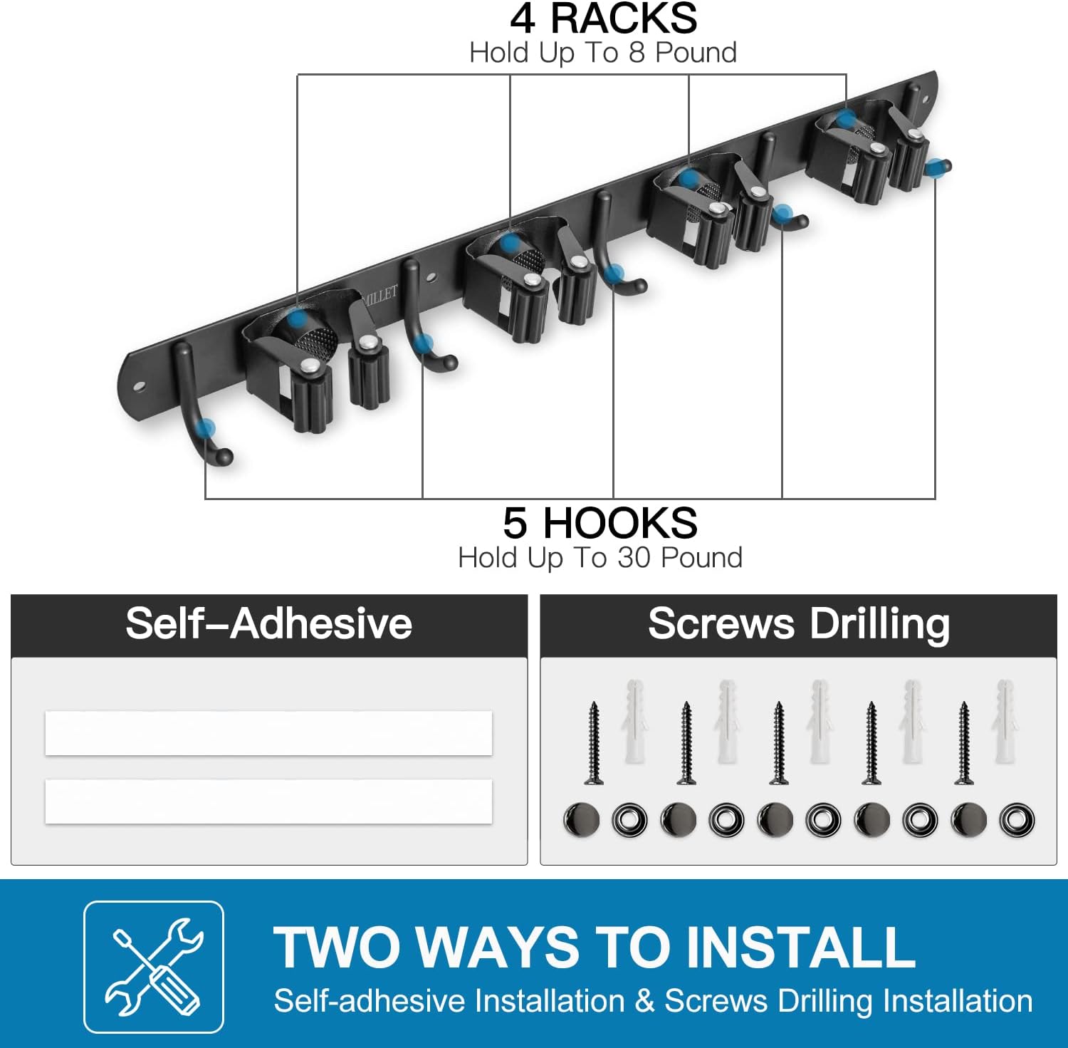- 🧹 EASY TO USE and INSTALL: You can push the broom in and remove it with one hand.Different from plastic holder with the spring loaded rollers, this mop broom holder has the rubber rollers to hold the handles and allows for the handle to slide in from the front and is held tight in place.Never worry about that it will hurt your hand.And there are two options to install, screws drilling and no drill.