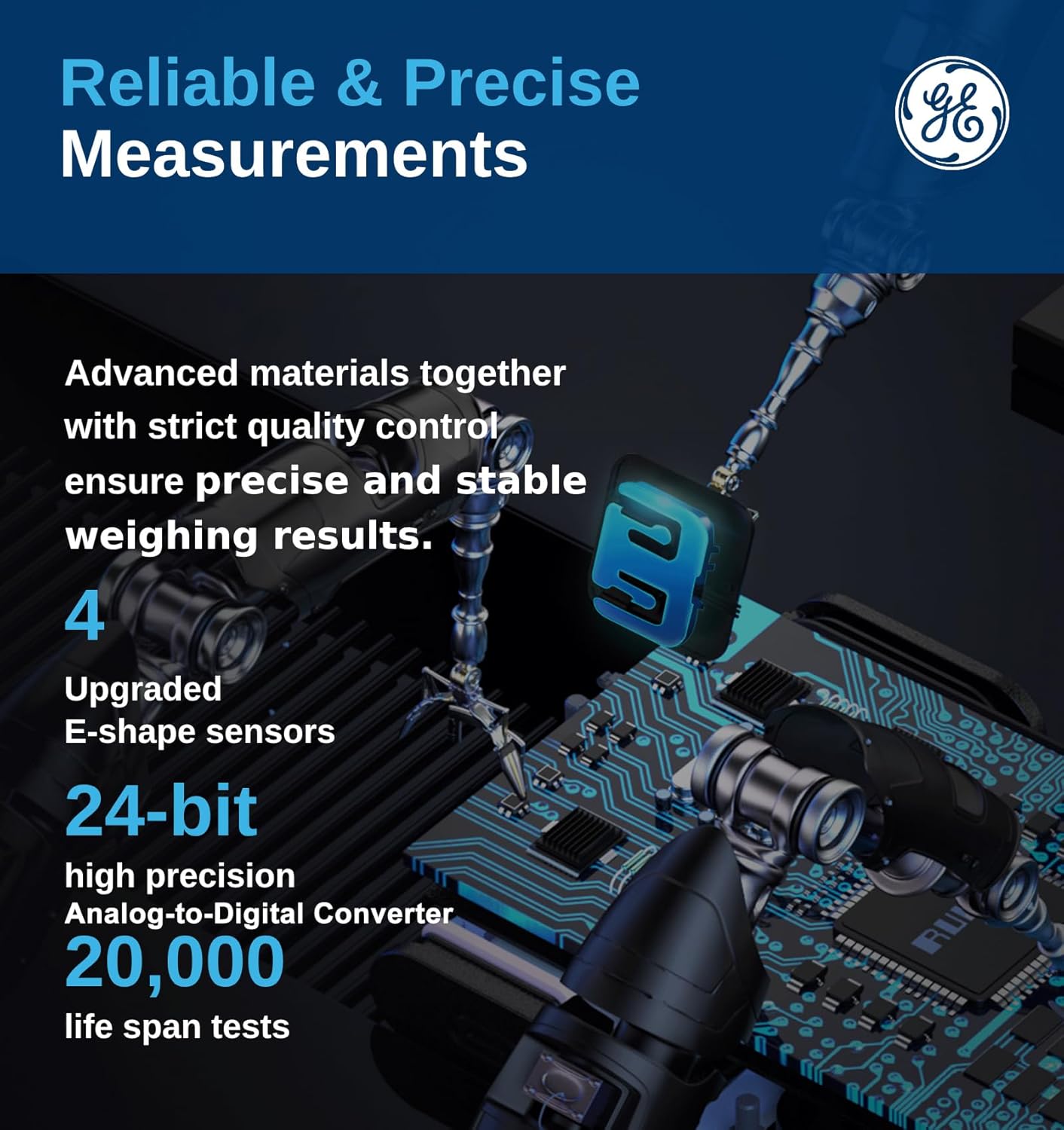 - Reliable and Accurate Measurements: This scale is equipped with E-shaped sensors with sensitive electrodes that accurately provide your weight metrics down to 0.1lb/0.05kg. increment. This scale's capacity is 400lbs. GE quality standards ensure the reliability and consistency of our smart scales