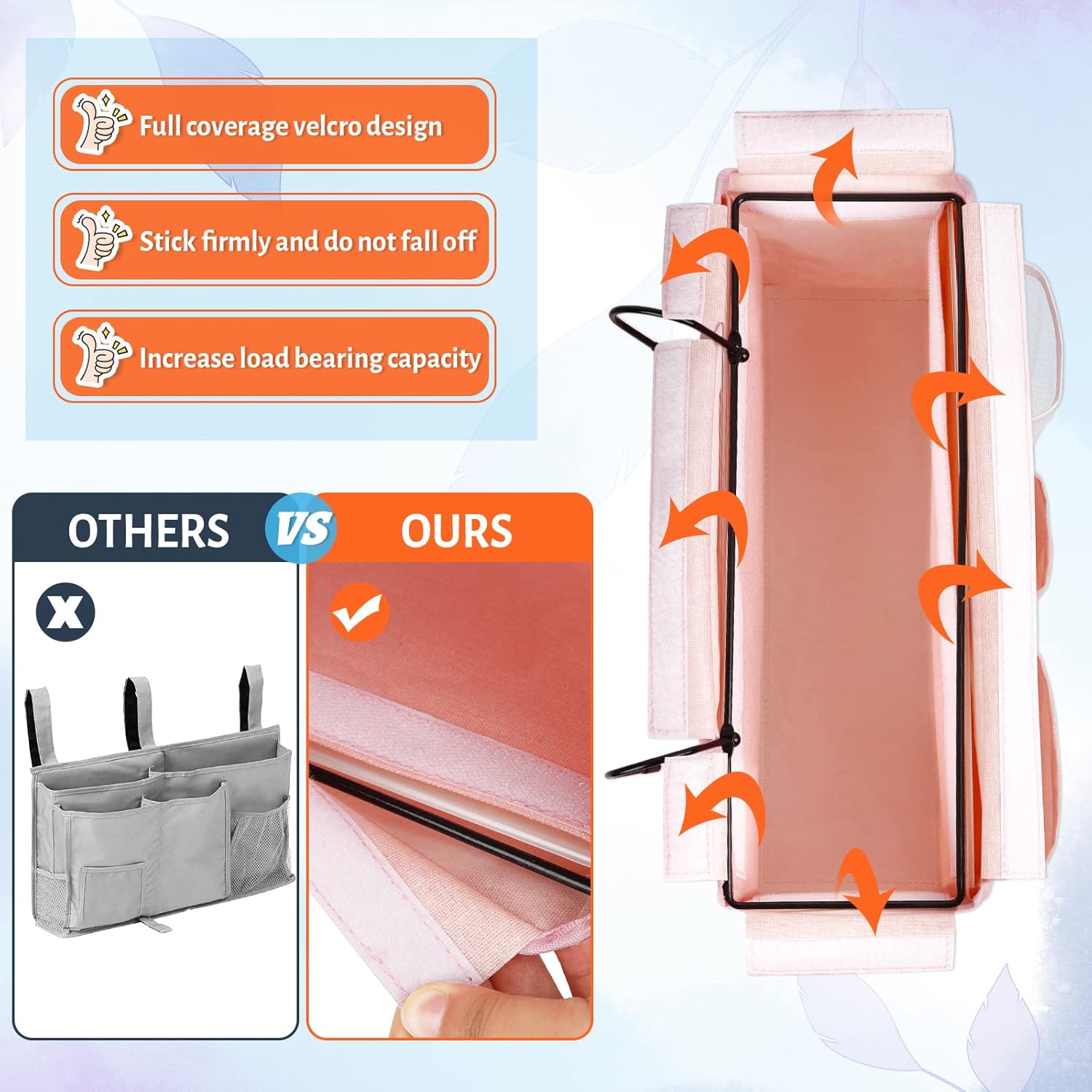 - 【Full Coverage Velcro & Cardboard Support】The metal frame on the top and inside of our bed organizer is fully glued and covered, and the front, back and bottom are equipped with removable rigid PP cardboard, which maintains a stable structure and shape, prevents tipping, and is more stable and enduring.