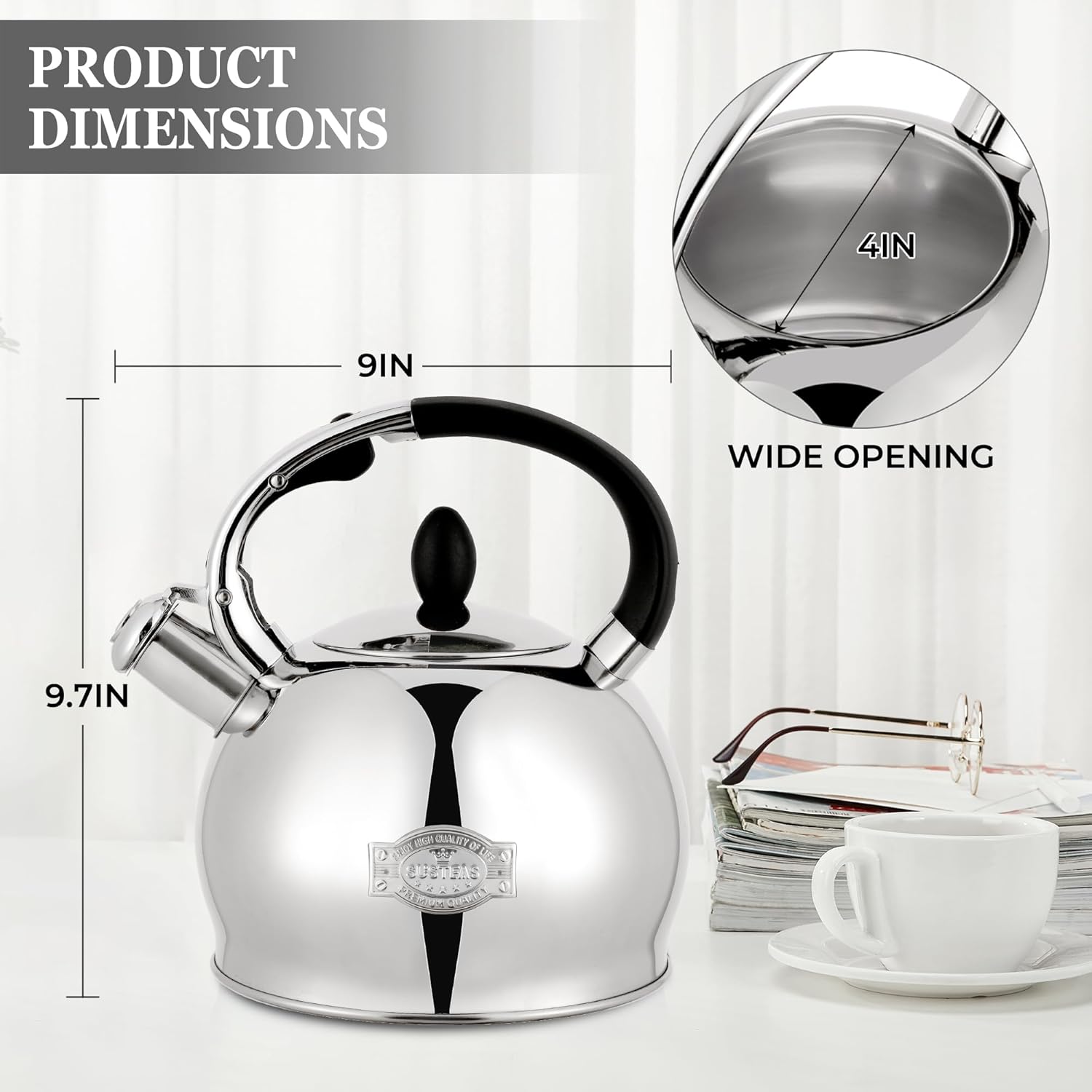 - SUSTEAS BRAND TEA KETTLE - SUSTEAS is a premium brand on Amazon, our tea kettle for stove top is 100% Teflon and BPA-avoiding materials. 1 Year Assurance so you can buy with confidence and boil happily ever after