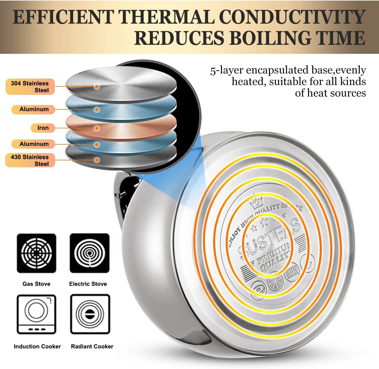 - INNOVATIVE BOTTOM BOILS WATER FASTER - SUSTEAS tea kettle is made of 5 layers encapsulated base, which improves heating performance while reducing heat loss, greatly shortening boiling time. It is compatible with all types of cooktops, including induction, gas, electric, halogen and radiant cooktops. Let you have a premium quality cup of tea or coffee at home