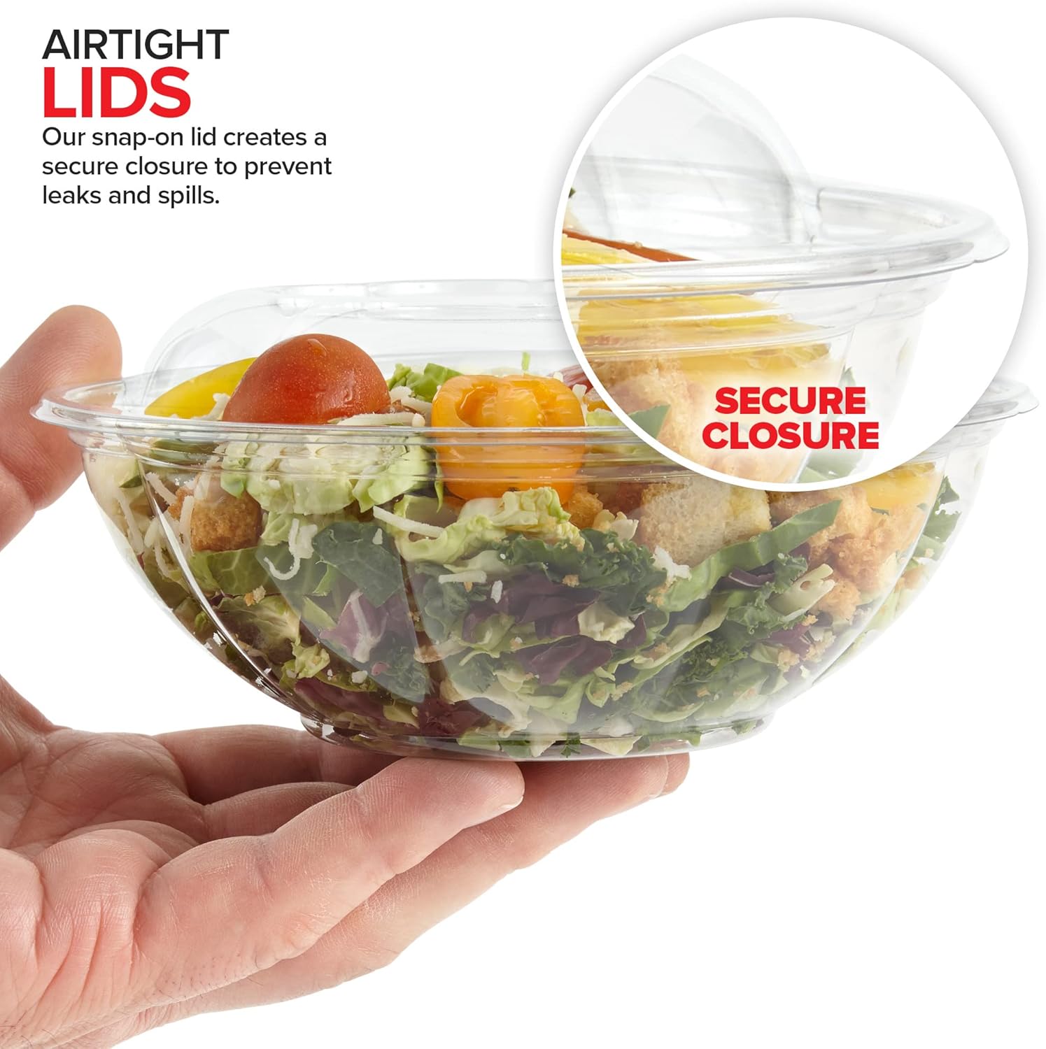 • Airtight Lids: Our snap-on lid creates a secure closure to prevent leaks and spills. This also helps keep your salads fresh and delicious!