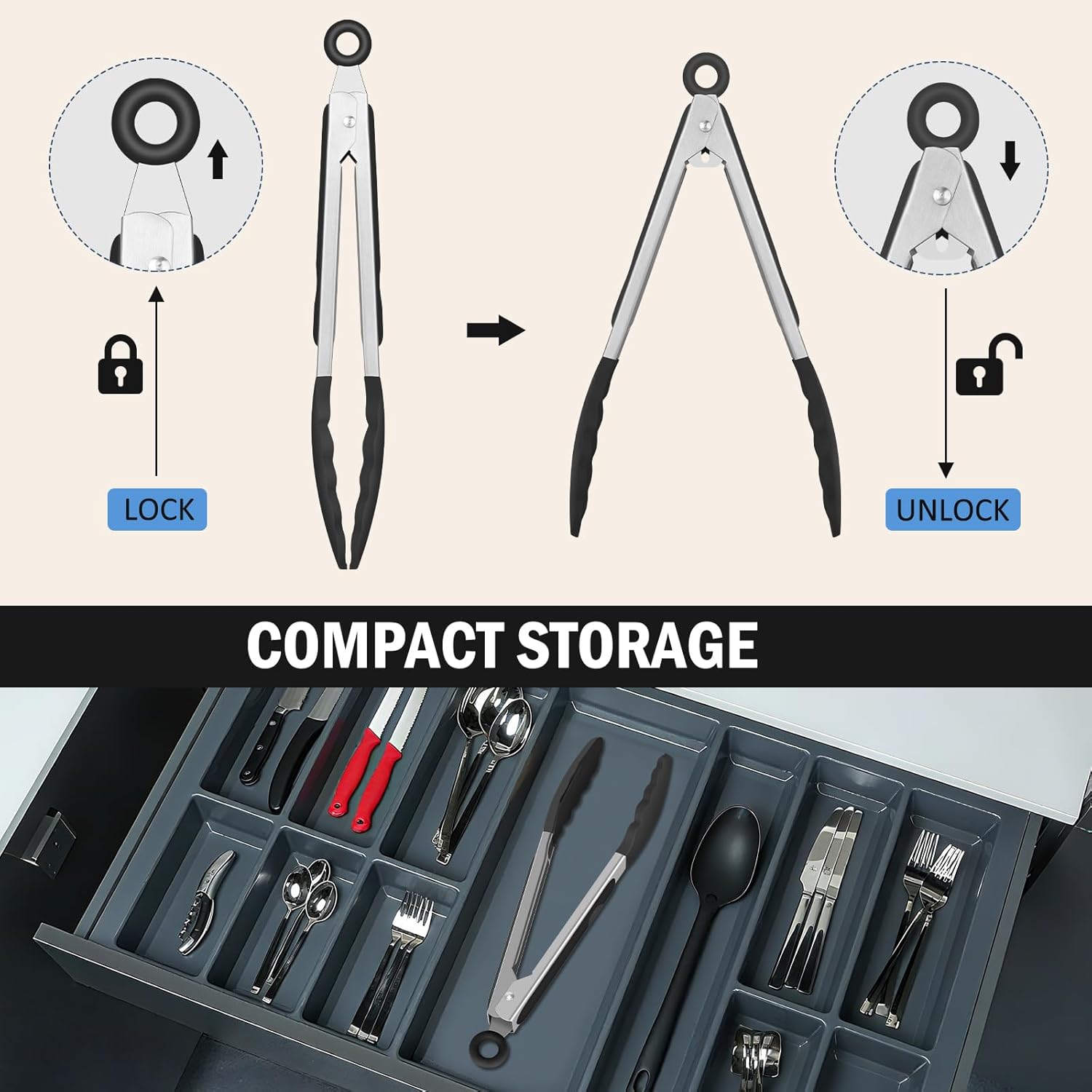 - Locking Mechanism: This Cooking tongs have a ring pull locking mechanism, pull the ring for lock to save space, and push for open can be one-hand opration. Also include a hanging ring for easy hang and storage.