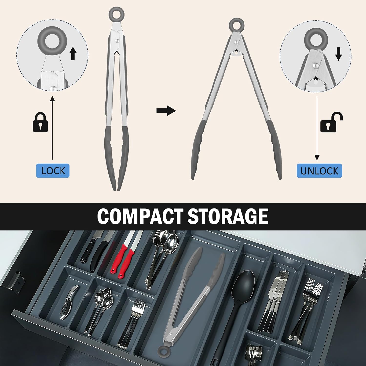 • Locking Mechanism: This Cooking tongs have a ring pull locking mechanism, pull the ring for lock to save space, and push for open can be one-hand opration. Also include a hanging ring for easy hang and storage.