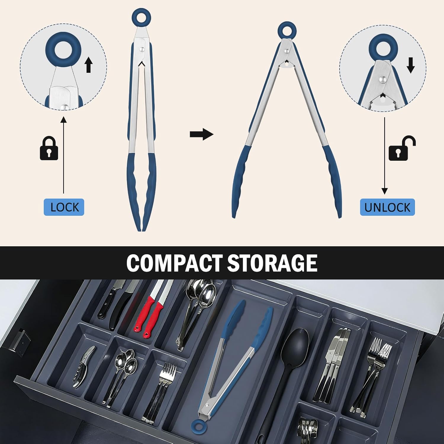 Kitchen Tongs, Stainless Steel Silicone Tongs for Cooking 600ºF High Heat-Resistant BBQ Grilling Locking Tongs, Set of 2-9" and 12" Classic Blue