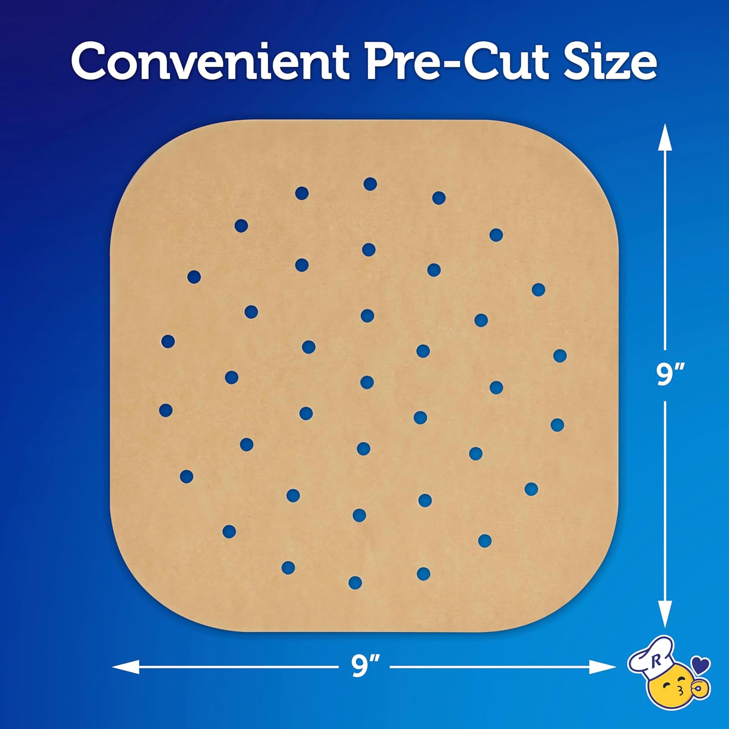 - Package Includes: Fifty (50) Reynolds Kitchens Unbleached Parchment Air Fryer Liners, measuring 9 in. x 9 in. each