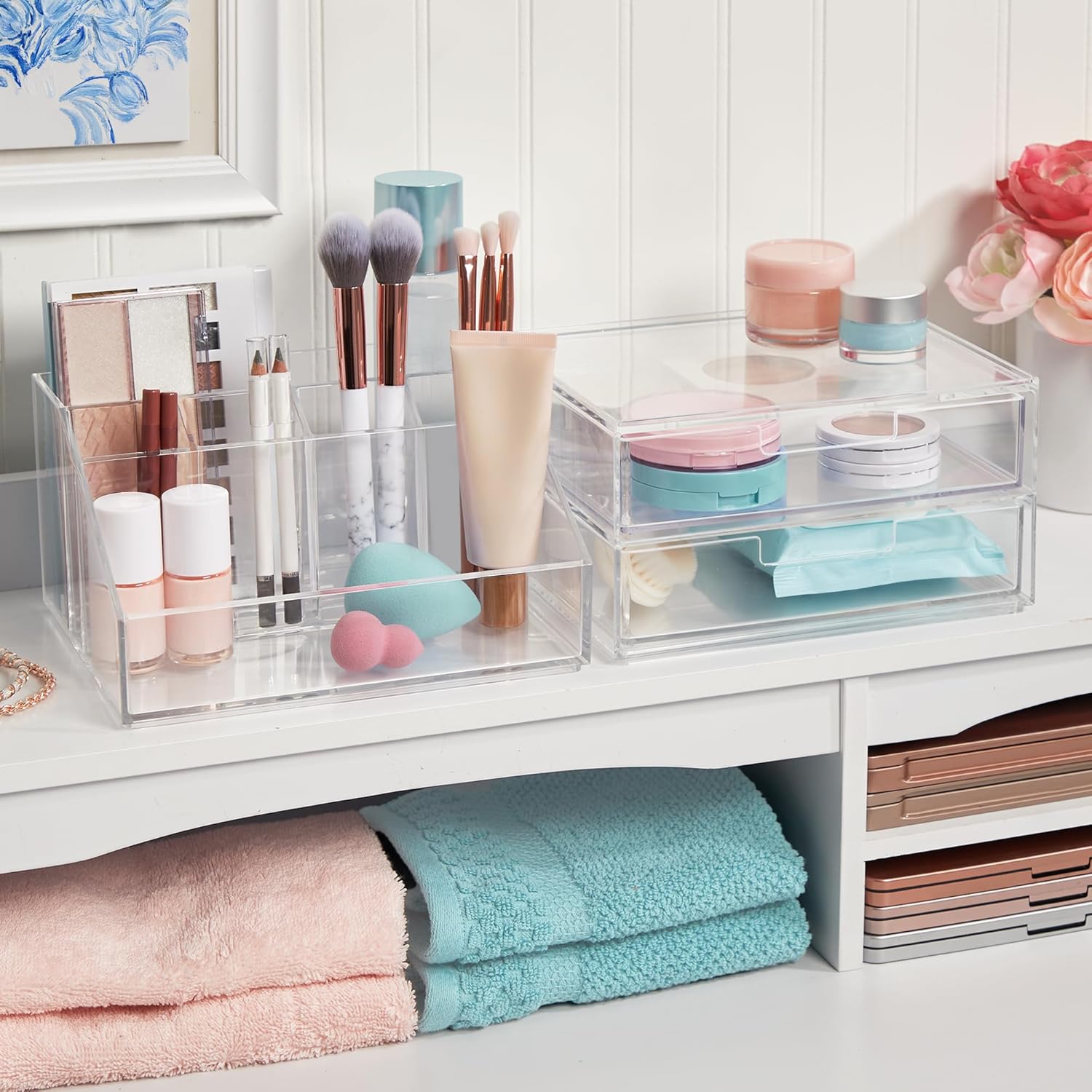 STORi Chloe Stackable Makeup Holder & Drawer Organizer Set, Clear, BPA-Free Plastic, Made in USA, Organize Brushes, Cosmetics & Beauty Essentials