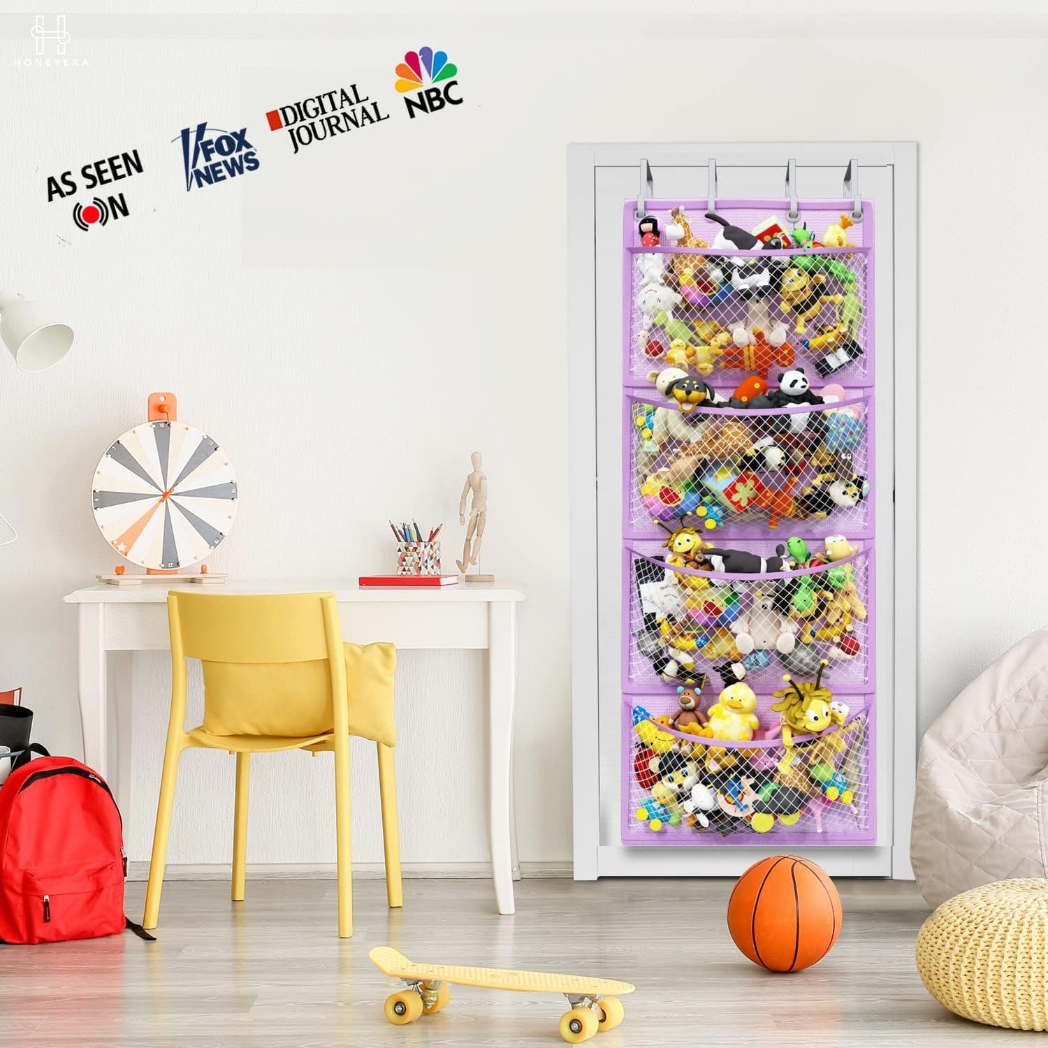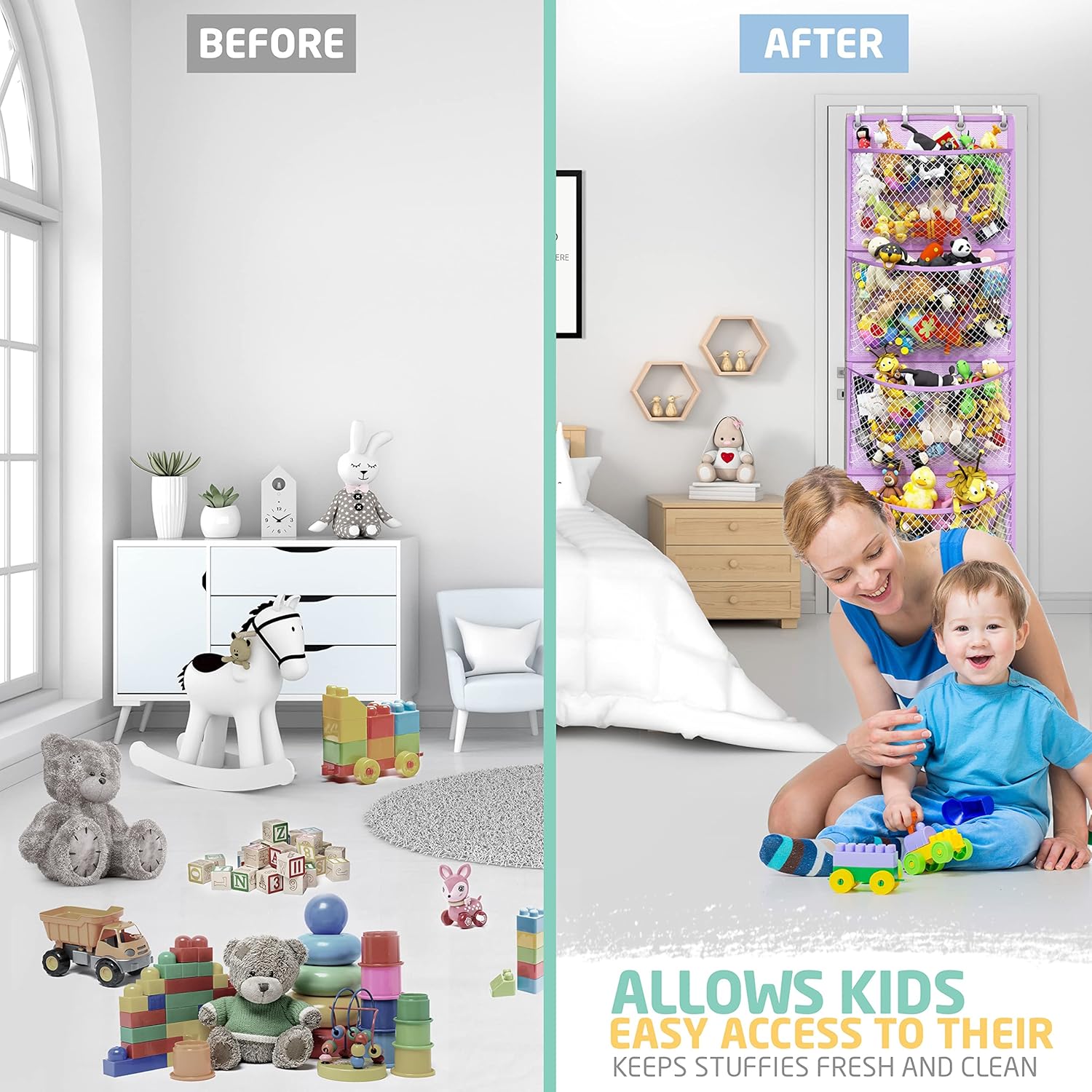 - 🧸 CONVENIENT STUFFED ANIMAL STORAGE - The perfect stuffed animal organizer to easily store and organize your favorite toys in our over the door storage unit. Easy to setup, durable, and allows kids convenient access to their toys. Equipped with breathable mesh pockets keeping your stuffies fresh and clean