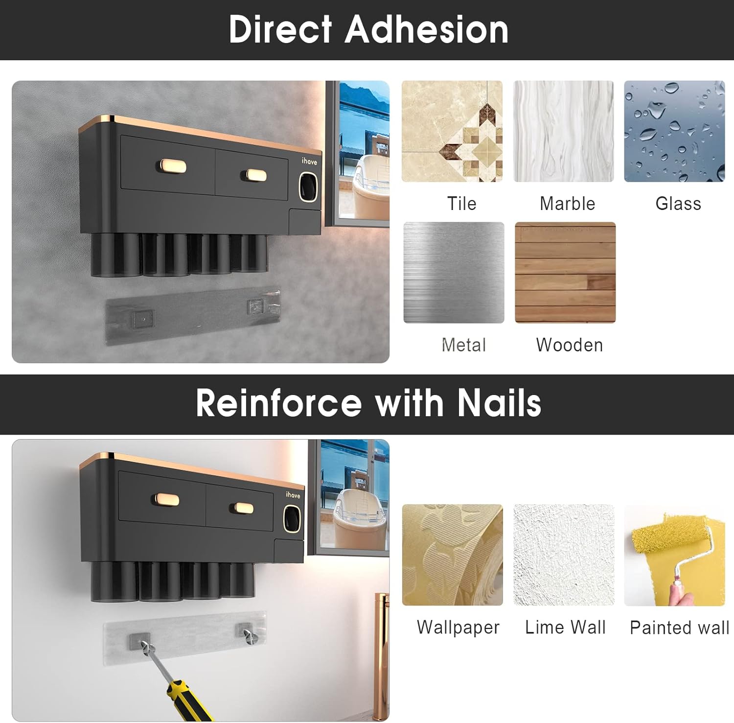 - Multifunction: The smart toothbrush holders have an automatic toothpaste dispenser, making it easy to squeeze the toothpaste without waste, saving you from the hassle of opening and closing toothpaste tubes. The magnetic mouthwash cups come with an upside-down drain, dust-proof, and waterproof to keep your cups clean and dry, eliminate the need for separate rinsing cups and streamline your daily routine.