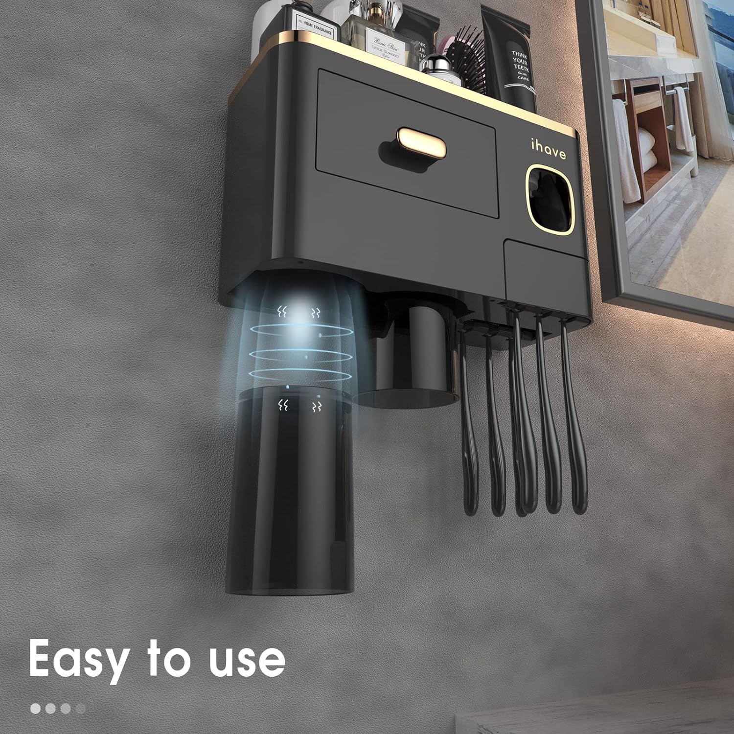 iHave Toothbrush Holders for Bathrooms - Upgrade Wall Mounted Toothbrush Holder with Toothpaste Dispenser - 2 Cups, Large Capacity Tray, Cosmetic Drawer - Bathroom Decor & Bathroom Accessories