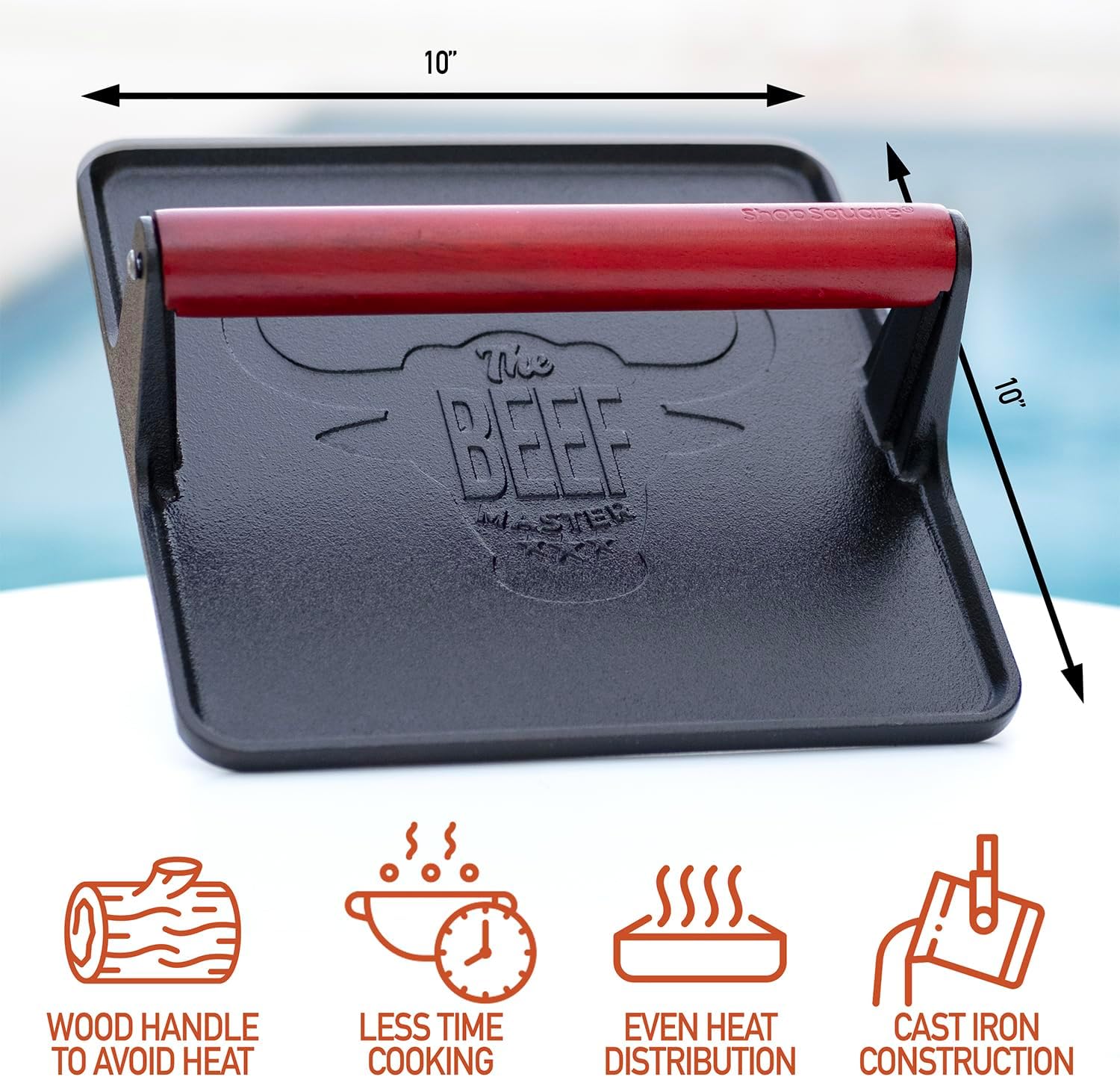 The Beef Master Cast Iron Grill Press - XL Burger Press, Pre-Seasoned Griddle Press, Heavy Duty Meat Press for Bacon, Burgers, and Steak with Cool Touch Handle - 10”x10”x4”