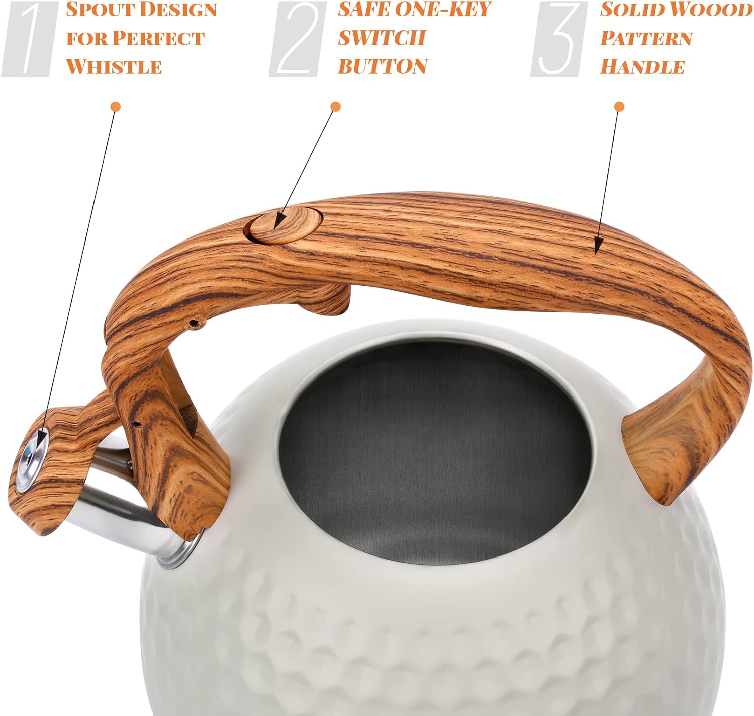 - [Loud Whistling Sound] The whistling kettle will alert you when the water is boiling, even if you are busy doing chores, watching TV, listening to music or other things. The loud whistle allows that you can hear it from another room when the water is boiled. Effectively reduce Safe hazards and prevent excessive boiling.