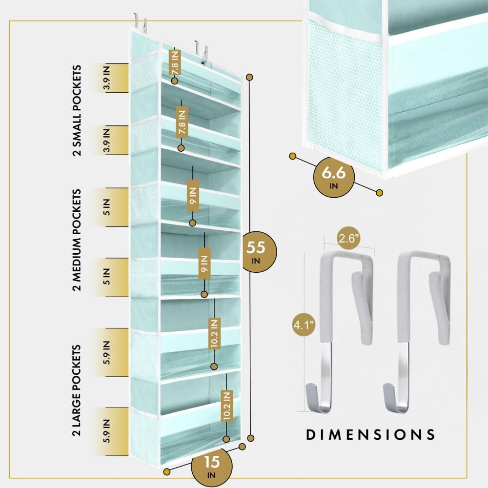 - 🏡 6 Multisized Front Pockets: Unlike other over the door organizer that only comes with 4-5 pockets with one sized depth, we upgraded and improved our hanging door organizer to cater all your door storage needs. Our over the door storage organizer comes with 6 pockets with 3 different sizes and depth to fit all kinds of items you need to store. The two top pockets of our door organizers and storage are specifically designed to be shallower so that the items stored can be easily reached.