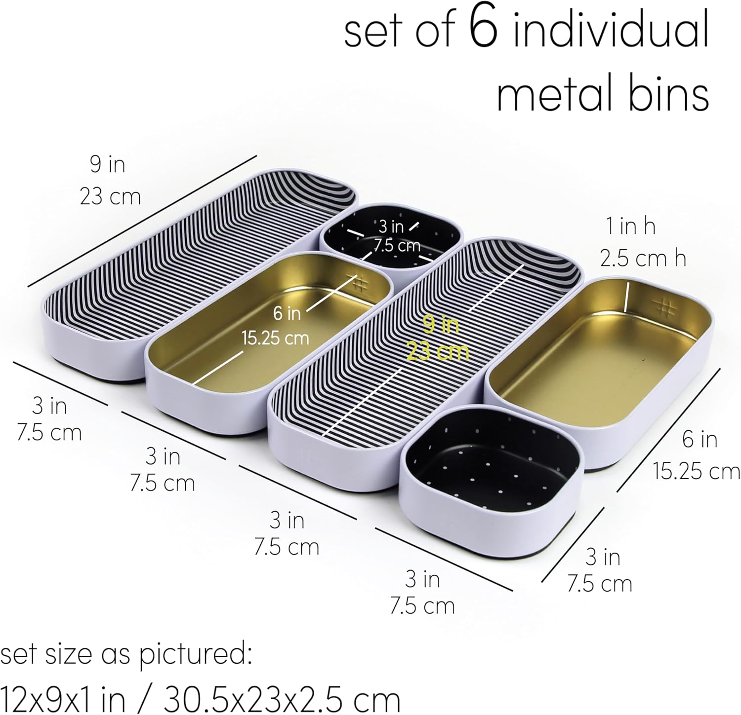 Three by Three Seattle 6 Piece Shallow Metal Organizer Tray Set for Storing Makeup, Stationery, Utensils, and More in Office Desk, Kitchen and Bathroom Drawers (1 Inch, Gold Dots and Stripes)