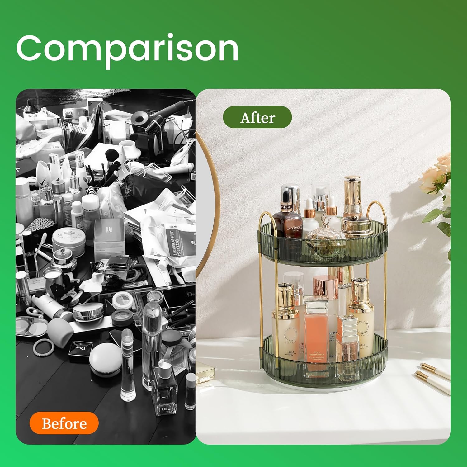 - 👑【360°Rotating Design】Unlike conventional vanity organizers, this innovative rotating skincare organizer boasts a seamless 360-degree rotation capability. With just a gentle rotation, you can effortlessly access all your makeup essentials, making the selection process a breeze. This skin care organizer's high tray edge are thoughtfully designed to prevent any messy spills.