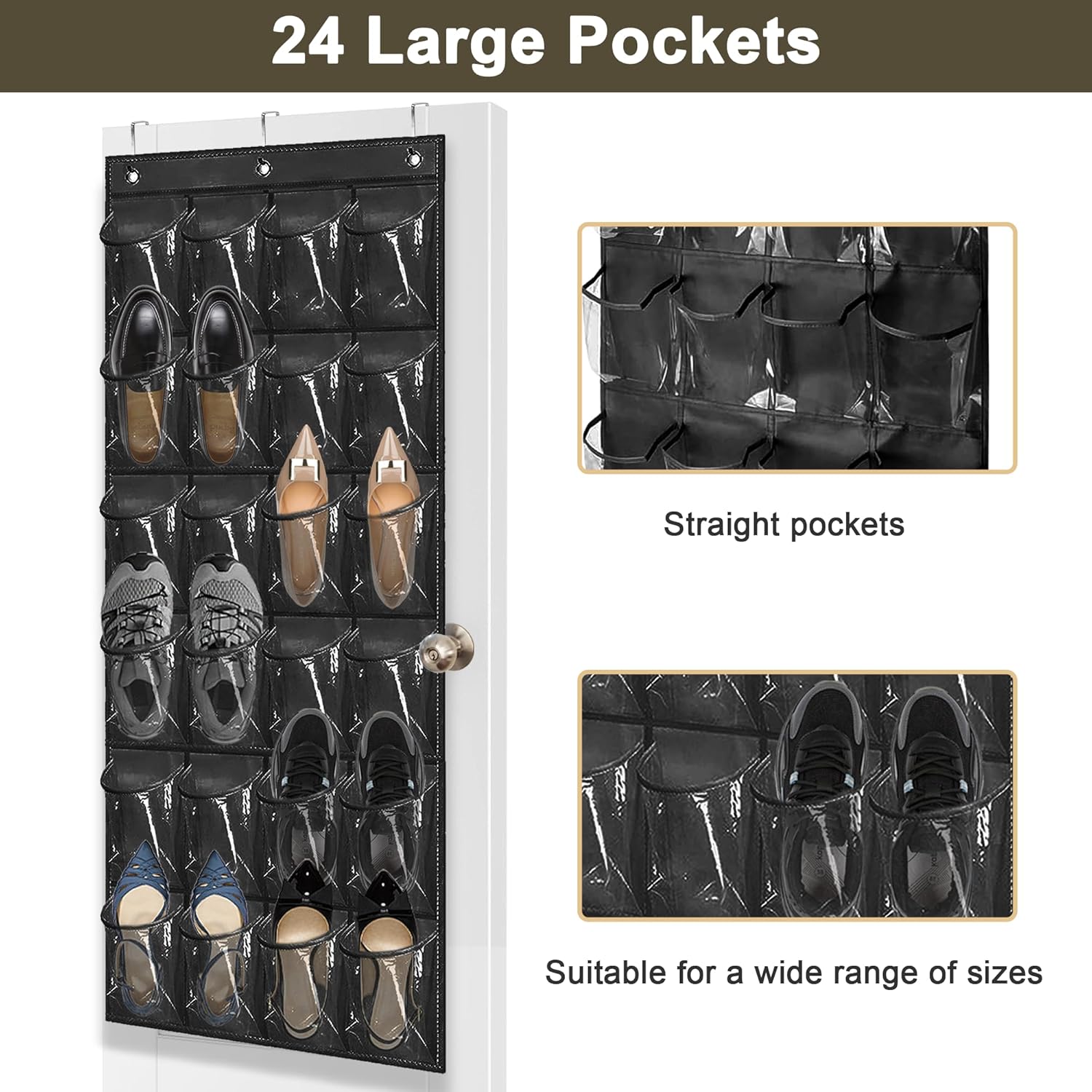 Over The Door Shoe Organizer - Space Saving Shoe Rack for Closet Door with 24 Pockets and Hook, Shoe Holder Back of Door Organizers for Shoes, Hanging Shoe Organizer (Black)