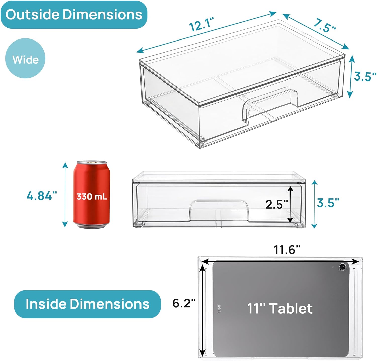 - [Stackable Design] Come with 2 drawer storage organizers, each organizer measures 7.5"D x 12.1"W x 3.5"H. The storage containers are stackable, vertical storage will save a lot of space. You can also use them side by side. Put your small objects on top of acrylic bins to make your countertop space more tidy.