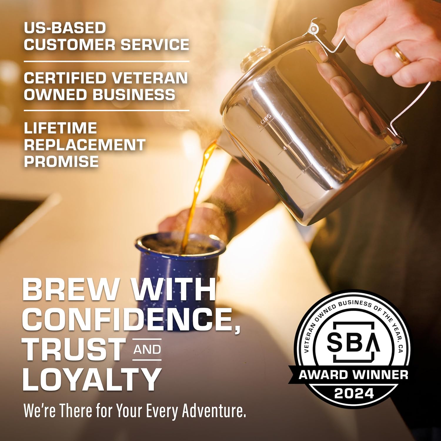 - LIFETIME REPLACEMENT GUARANTEE – A camping coffee pot should last a lifetime, and this one will. If it ever fails, we'll replace it. Built for adventure, backed for life. As a veteran-owned company, COLETTI stands behind every coffee percolator we make. Wherever the road takes you, this percolator is ready—Make Great Coffee Anywhere