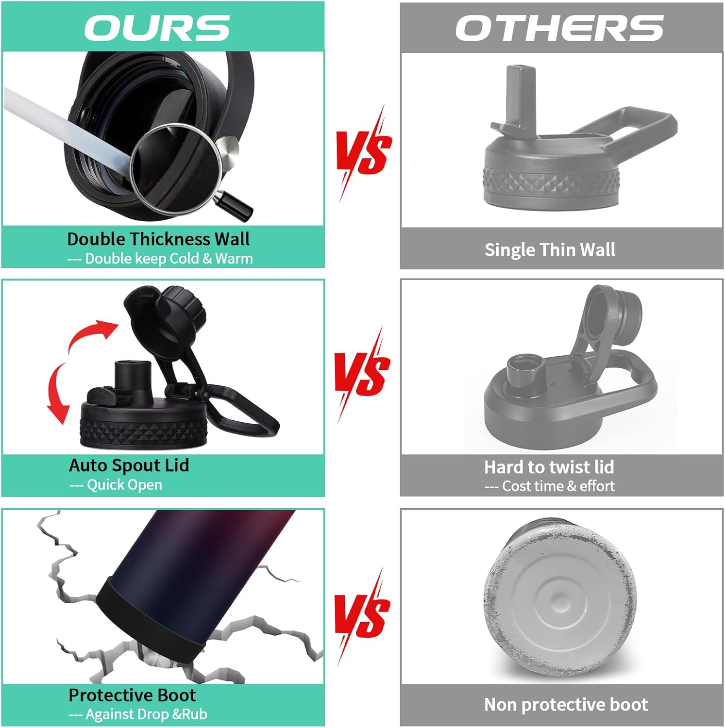 • 2 LID OPTIONS (Auto-spout & Straw): two different lids are complete LEAK PROOF & design for easy drink. The pops-up lid for easy drinking and seals shut for no leaks when you're on the go. The straw lid makes it easy to enjoy spill-proof sips, and package come with a alternative straw & a straw brush for easy cleaning
