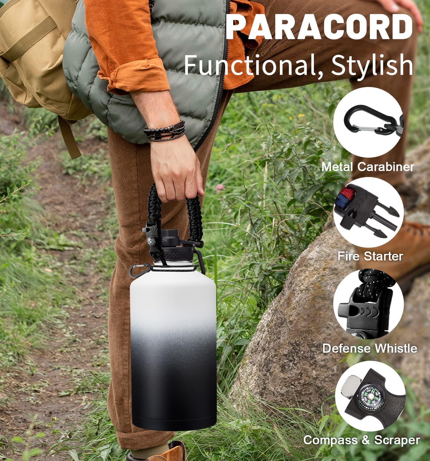 • UNIQUE DESIGNS PARACORD HANDLE: Full-function paracord handle made in individual styles to match the color of the flask water bottles. With compass, safety ring, carabiner, flint fire starter & whistle. It unravels into a sturdy and taut rope in an emergency, making the large water jug an ideal survival kit for expeditions in the wild