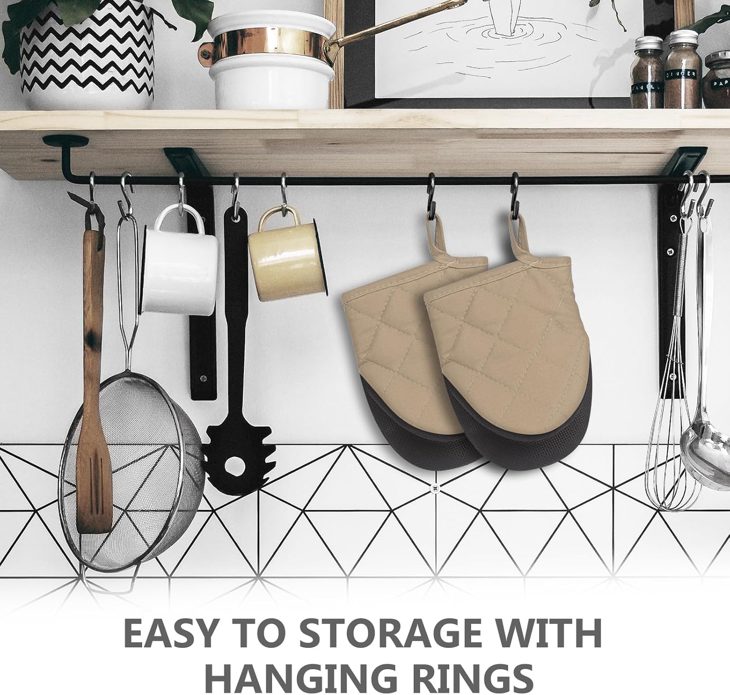 - 【Easy Clean & Storage】- If you get any food on them while wearing, just gently swish around in soapy water or just wipe them clean. Both the surface of silicone and inner lining can be cleaned. You can hang it up with the nice hanging hook in the cuffs.
