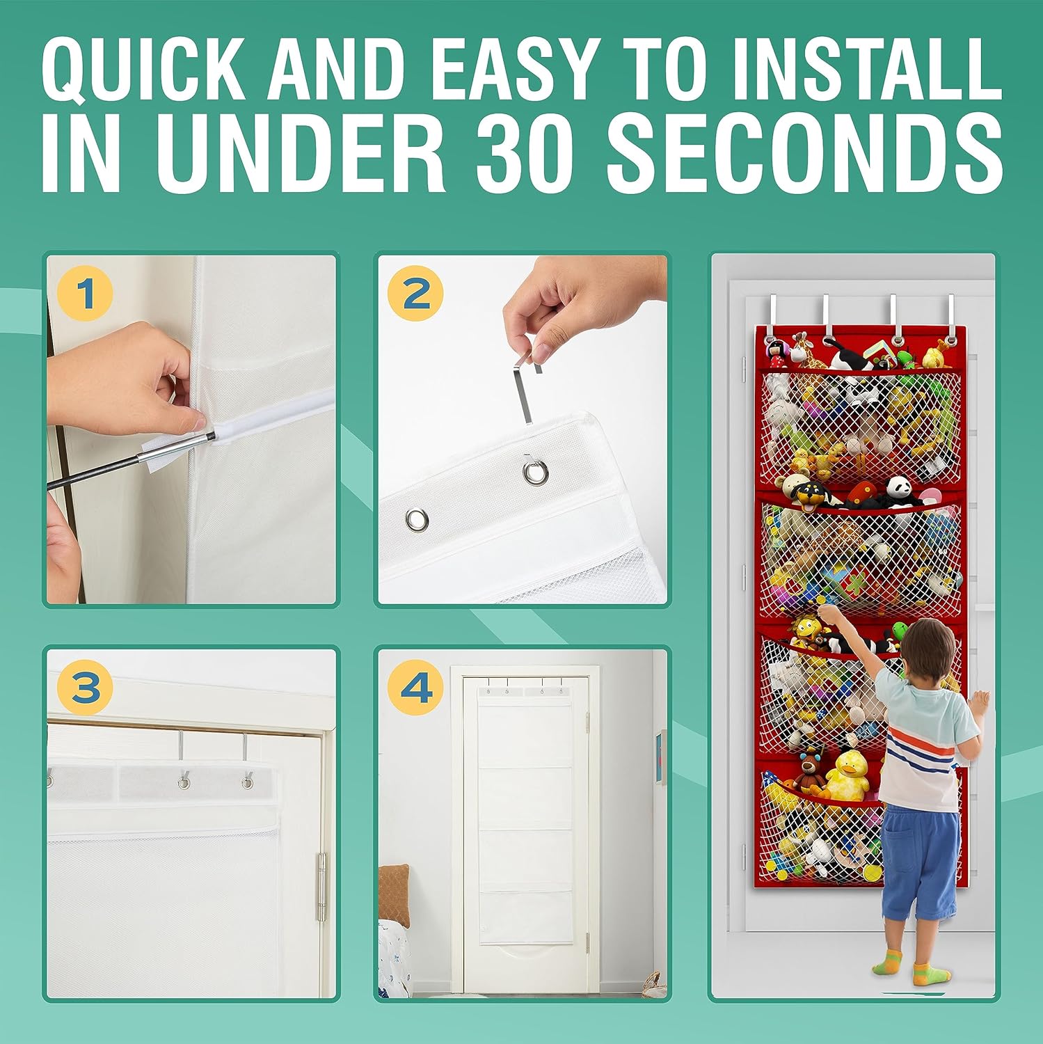 - CONVENIENT STUFFED ANIMAL STORAGE - The perfect stuffed animal organizer to easily store and organize your favorite toys in our over the door storage unit. Easy to setup, durable, and allows kids convenient access to their toys. Equipped with breathable mesh pockets keeping your stuffies fresh and clean