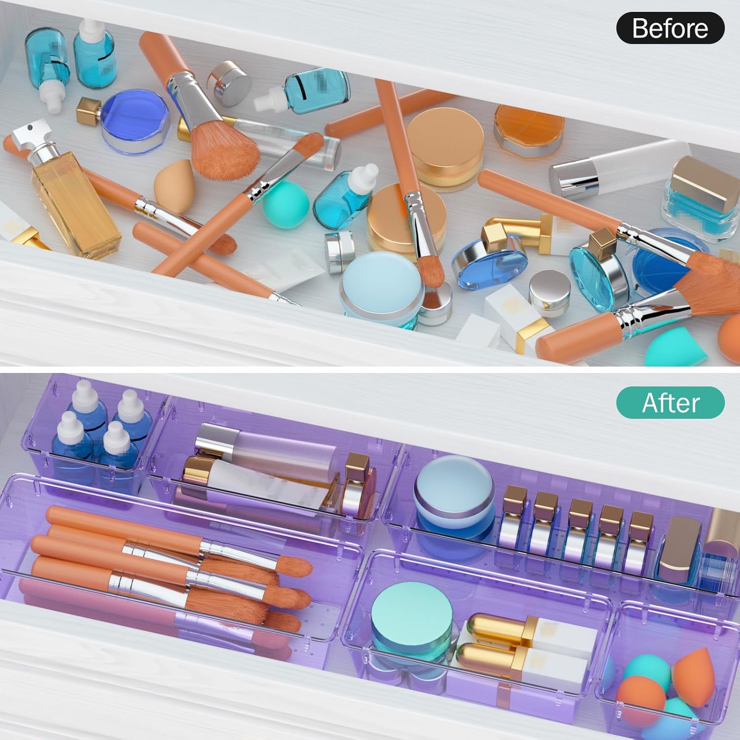 WOWBOX 6 Pack Clear Drawer Organizer Set, Acrylic Drawer Storage Trays, Storage Bins for Makeup, Cosmetics, Jewelries, Utensils, Gadgets, Office, Purple