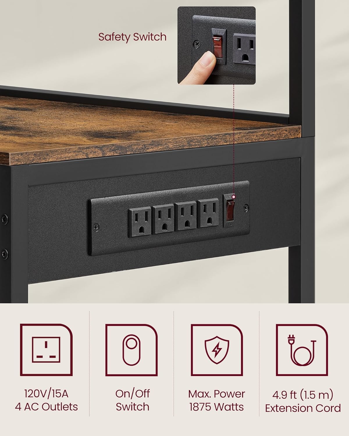 • [Safe Charging Station] This baker's rack features a power outlet with 4 AC outlets, equipped with overload, leakage protection, and an on/off switch, ensuring safe powering of multiple appliances