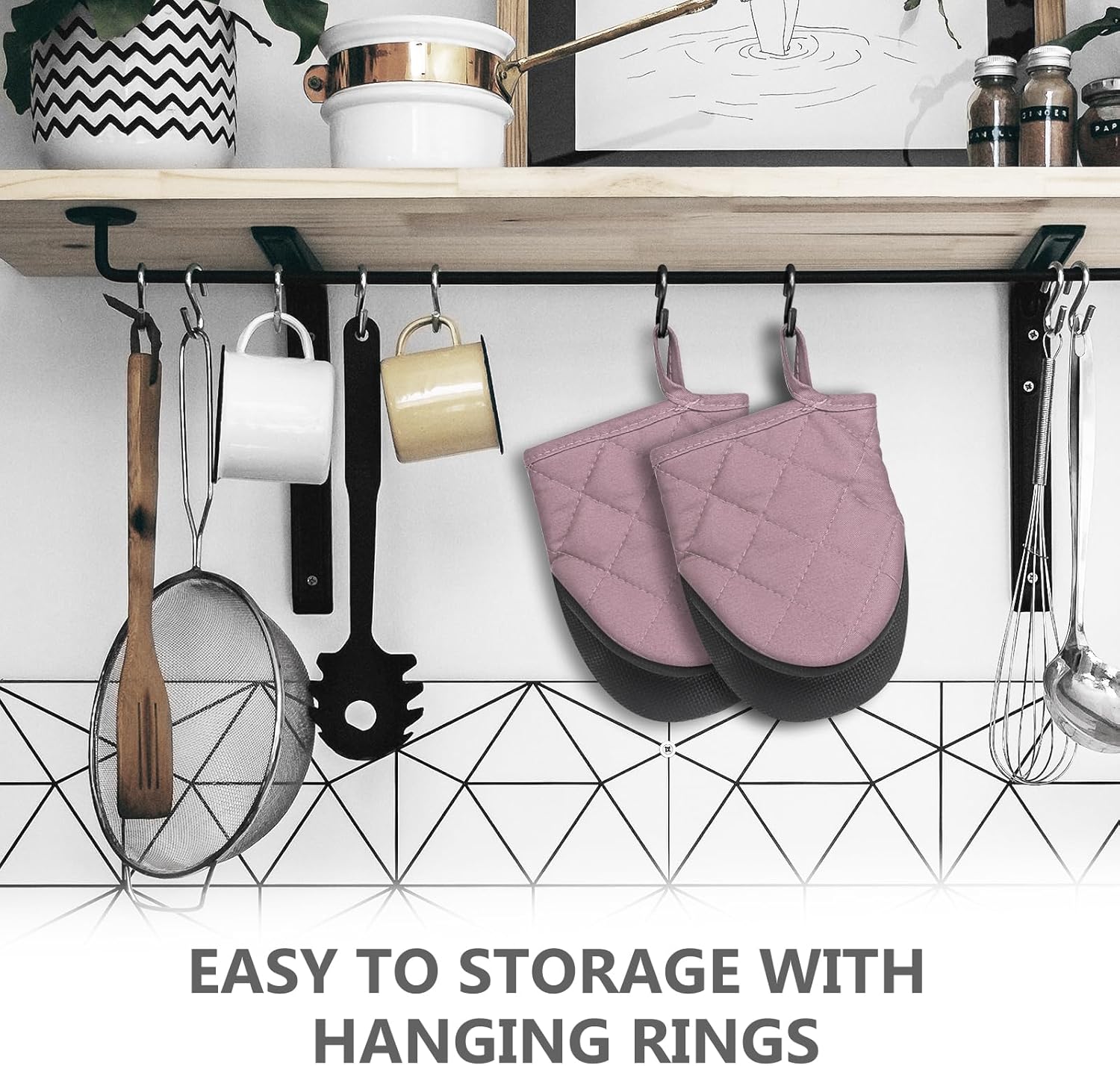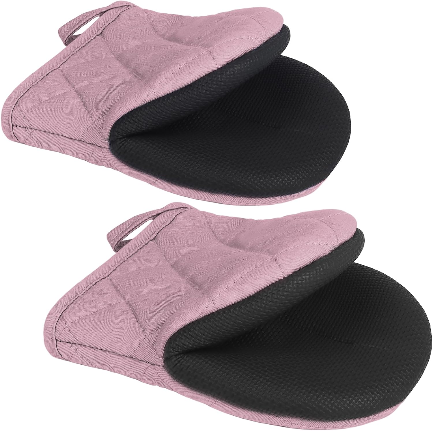 1 Pair Short Oven Mitts - Silicone Kitchen Oven Gloves High Heat Resistant 500℉, Mini Oven Mits with Non-Slip Grip Surfaces and Hanging Loop for BBQ, Baking, Cooking and Grilling (Pink)