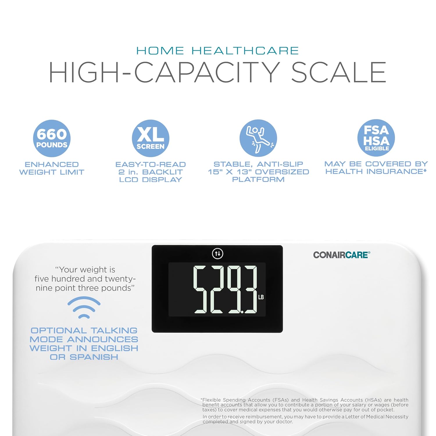 Conair Bathroom Scale for Body Weight, FSA/HSA Eligible High-Capacity Talking Bathroom Scale in both English and Spanish - 660 lb. Enhanced Weight Limit with XL Backlit LCD Display, Anti-Slip Platform