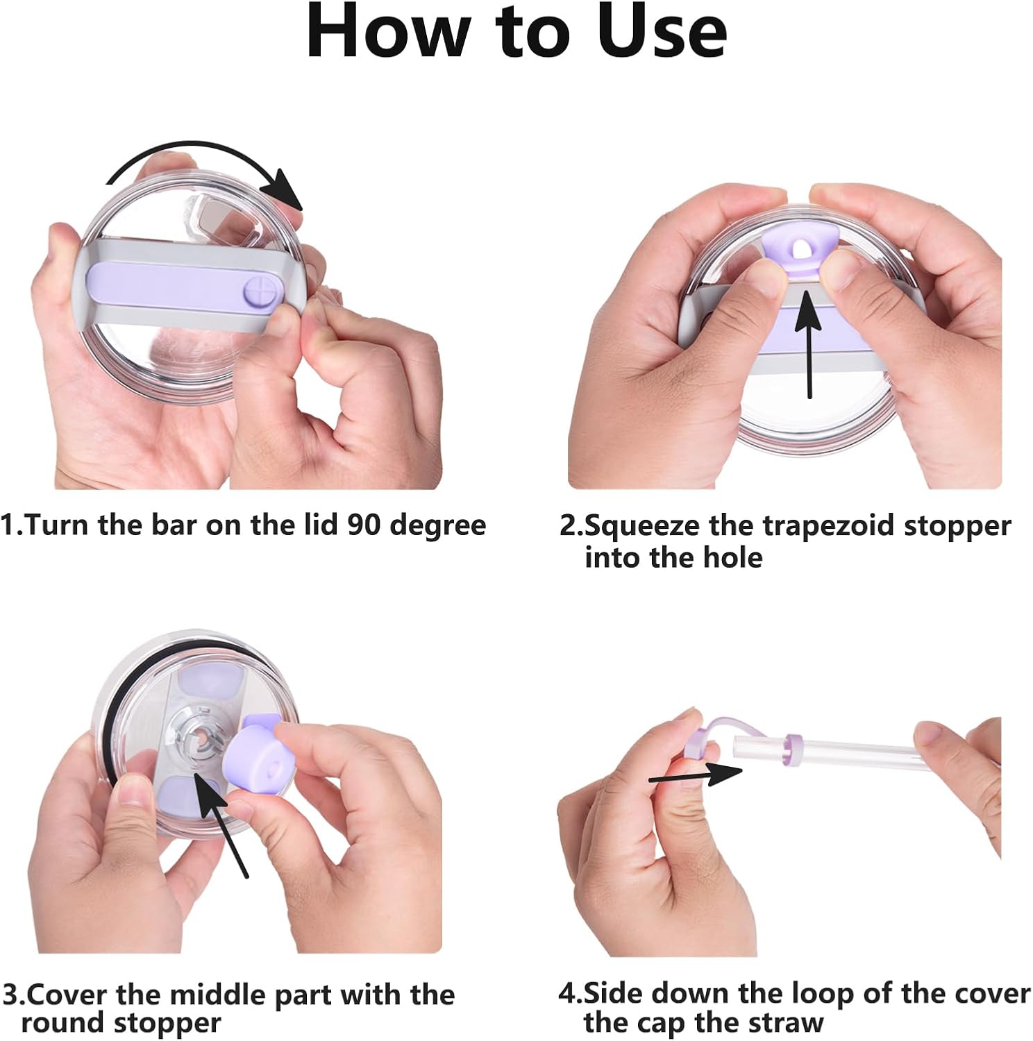 - Place the straw cover cap on the straw to prevent dust; Squeeze the square spill stopper into the sip part to seal for anti leak purpose; Round lid spill stopper is installed underneath the cup lid, press it downwards