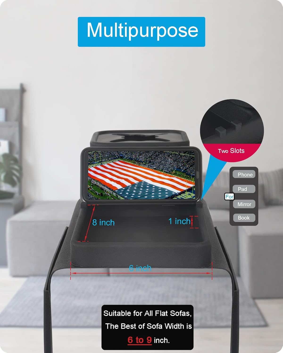 - ✅ LARGER SIZE, LARGER CUP HOLDER, LARGER TRAY: This couch tray has upgraded size and silicone material to fit sofas with 9.5inch wide armrests. The wider tray (6in) can easily hold your cell phones, ipad, remote controls, earbuds or snacks. Cup holder also increased the size and depth (3.5in), can hold multiple cup sizes, including handles on mugs.