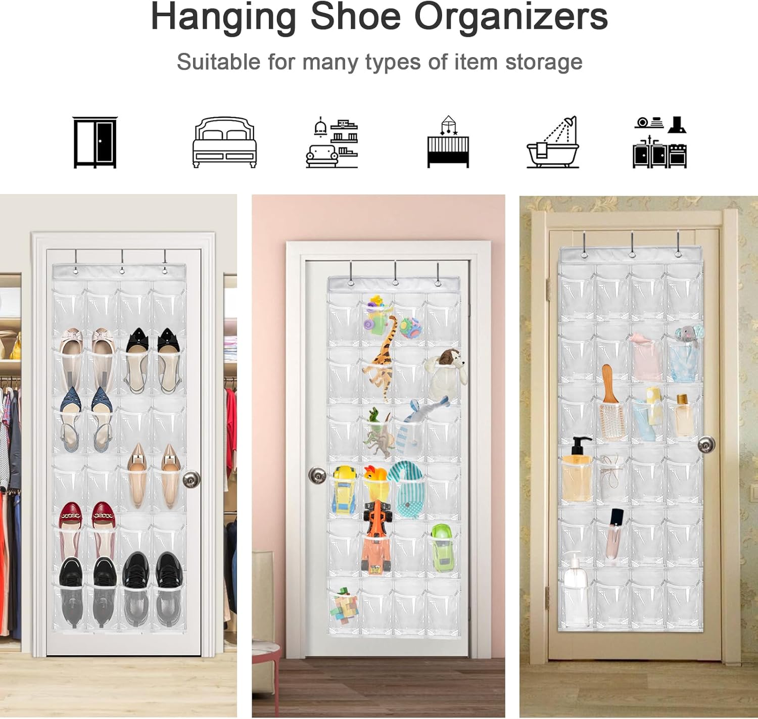 - 𝐒𝐩𝐚𝐜𝐞 𝐒𝐚𝐯𝐞𝐫: You can toss out your smelly and space-holding shoe rack now and get a new crystal clear shoe organizer behind the door. Our foldable organizer is perfect for dorm room or small apartments, it will hold up to 12 pairs of shoes with 24 pockets, or any other small personal items as well. Easy hanging on and moving out, simply take the organizer off and fold into a smaller piece for easy storage