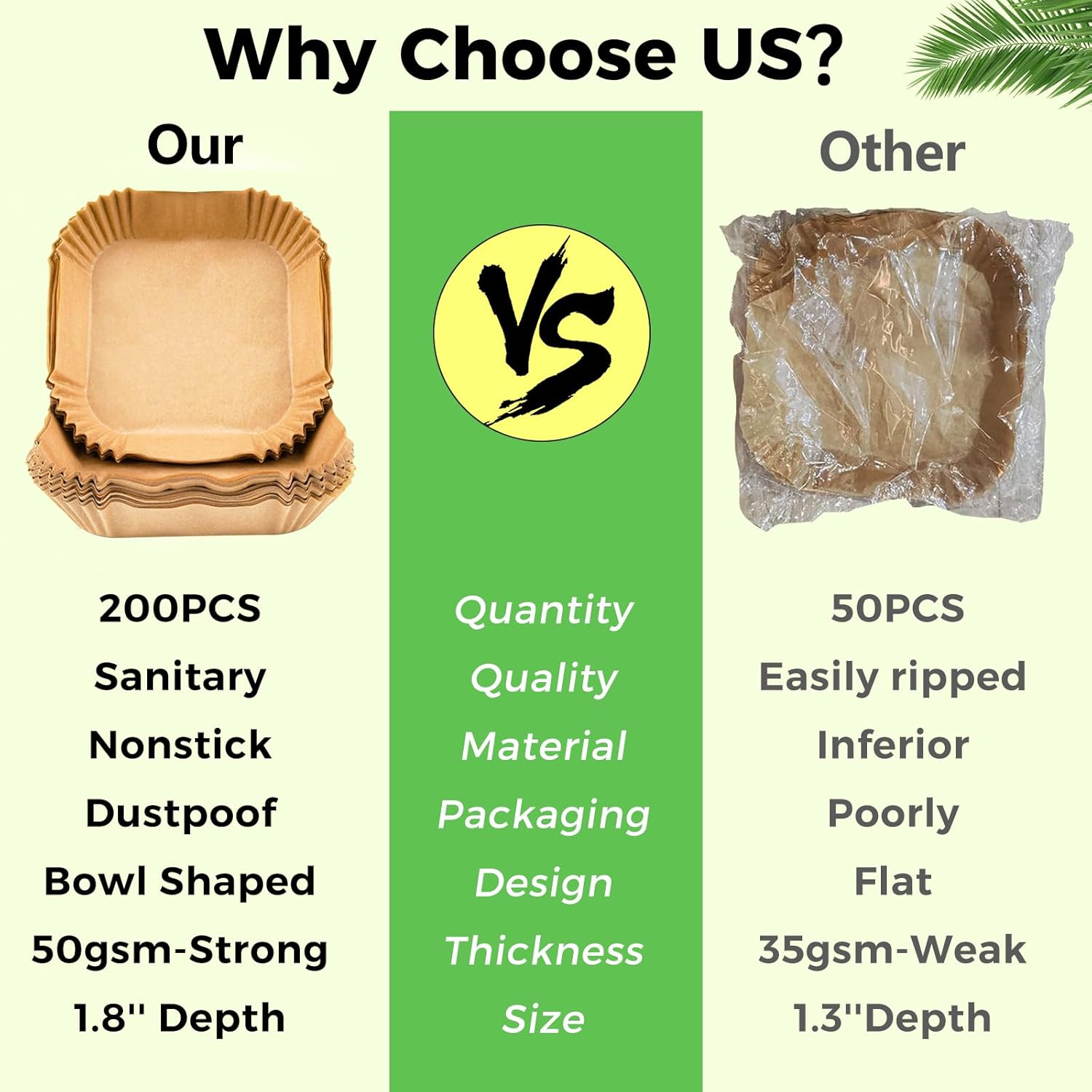 - Widely Used: These disposable air fryer parchment liners are great for baking, roasting, frying or serving food, lightweight and practical. Suitable for air fryers, microwave, ovens, steamers, etc. Just throw away the parchment liners after use.