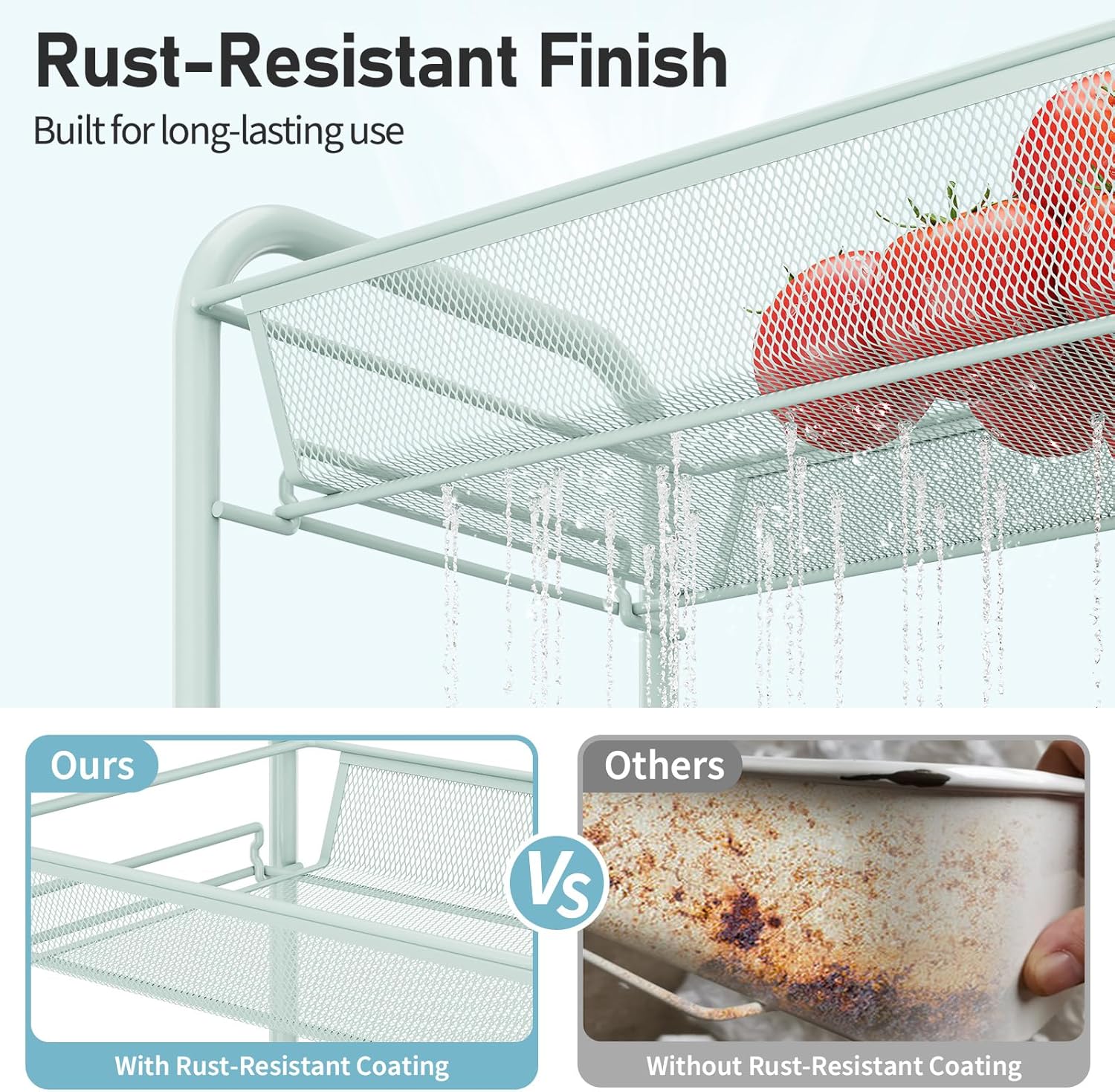• 【Breathable Mesh Basket】Our rolling utility cart with breathable mesh basket, convenient for draining. Basket with 6cm (2.4") heighten edge to prevent items dropping and with good load-bearing capacity. The weight capacity of each metal basket is up to 5 kg