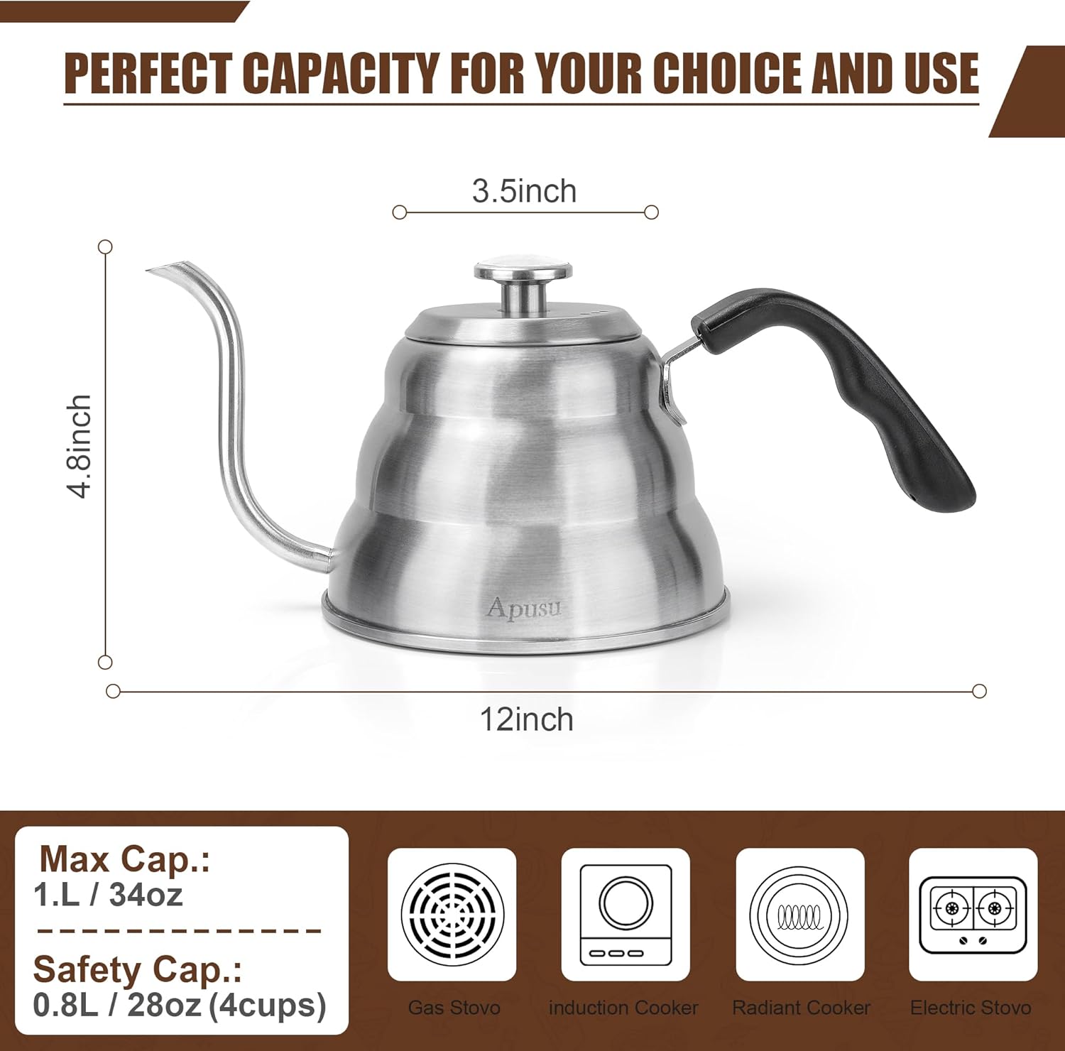 - ENJOY BETTER COFFEE AT HOME: The coffee pot is designed with a gooseneck spout. This kind of gooseneck kettle can ensure a precise and steady flow of water, which is the key ingredient to make a great drip coffee or tea. You can make s perfect cup of coffee for yourself, your loved ones and your family at any time. (1L Max Capacity, Please do not overfill the kettle to avoid overflowing and scalding injury.)