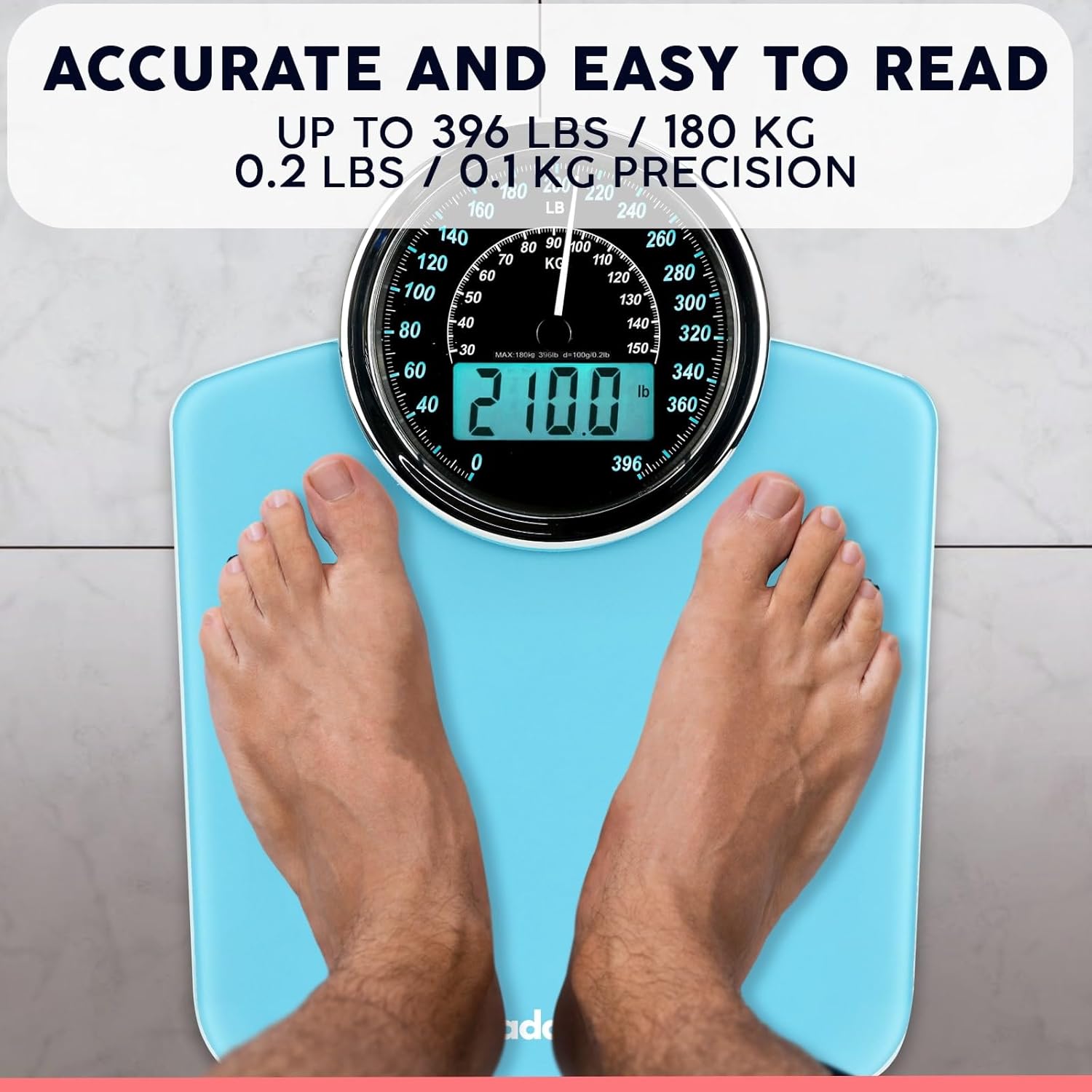 Adamson Hybrid 2-in-1 Analog & Digital Weighing Scale for Body Weight up to 400lbs - Thick Tempered Glass - Extra Large Display - Easy to Read Digital Bathroom Scale - New - Light Blue