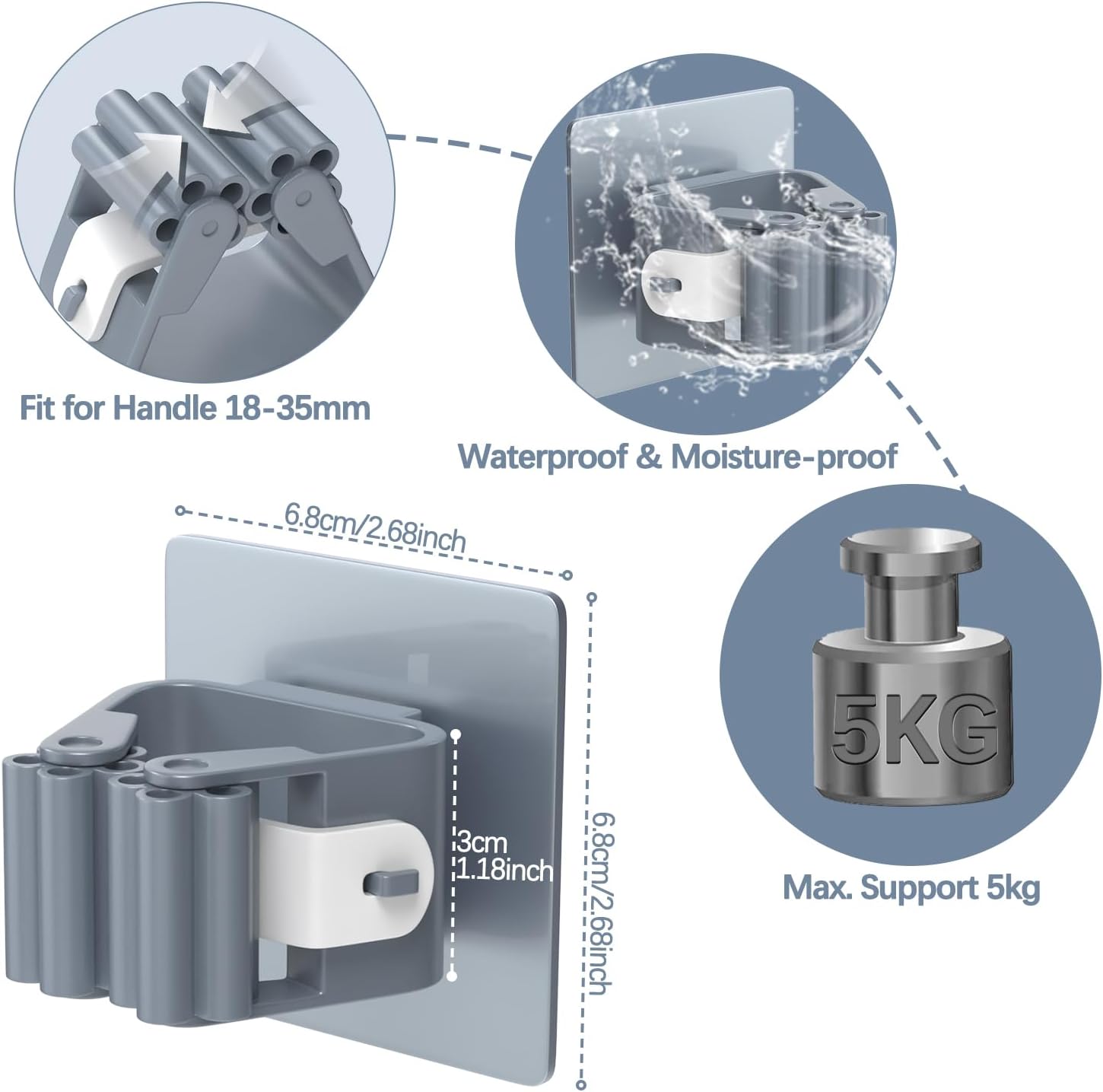- ✅【4-Pack Heavy Duty Broom Holder】Securely organize 4 brooms, mops, or tools with industrial adhesive backing. Holds up to 10 lbs on tile, wood, or painted walls - no drilling, screws, or damage!