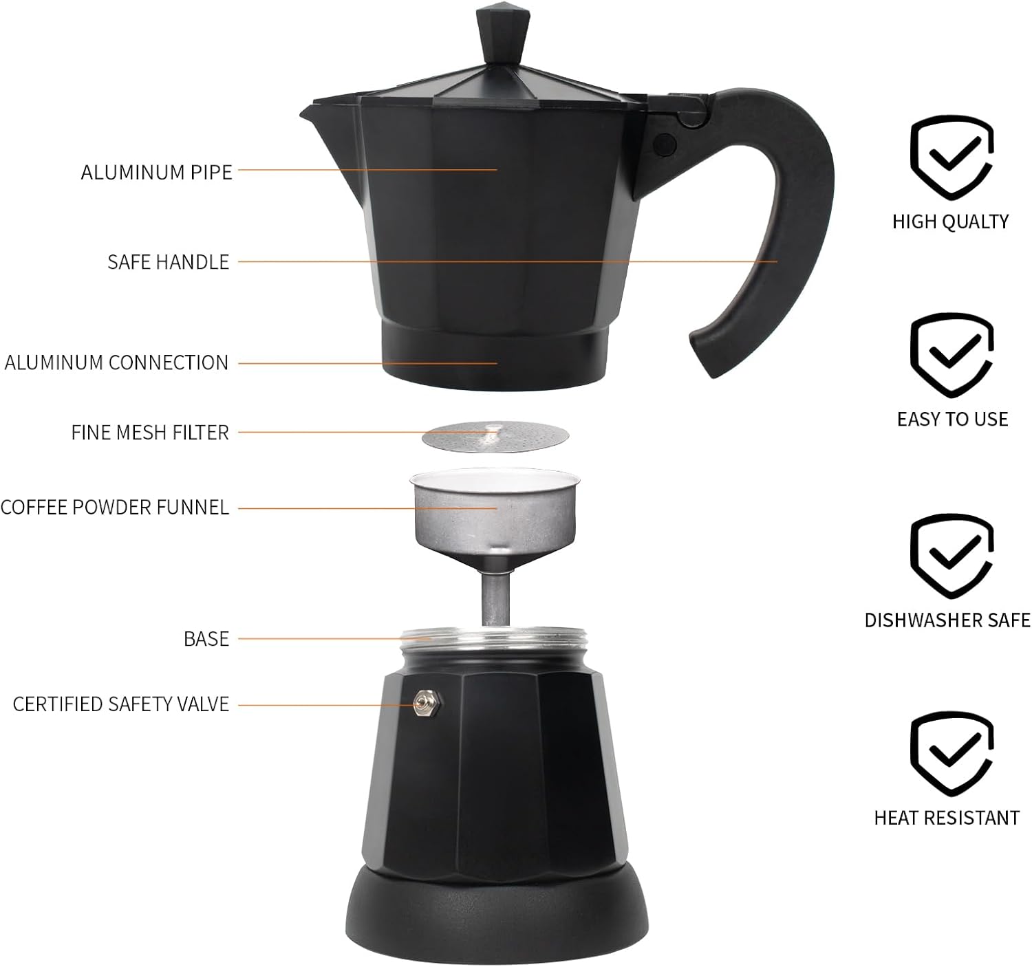 - 【6-Cup Moka Pot (300ml)】 – Ideal for Rich, Authentic Espresso.This classic stovetop brewer makes 6 servings (about 1.75oz each) – the traditional Italian way to enjoy strong, aromatic coffee. The 300ml capacity is designed for small espresso cups (not standard mugs), delivering concentrated flavor in every drop. Pro tip: Fill the base with water just below the safety valve, use finely ground coffee (no tamping!) for best results.