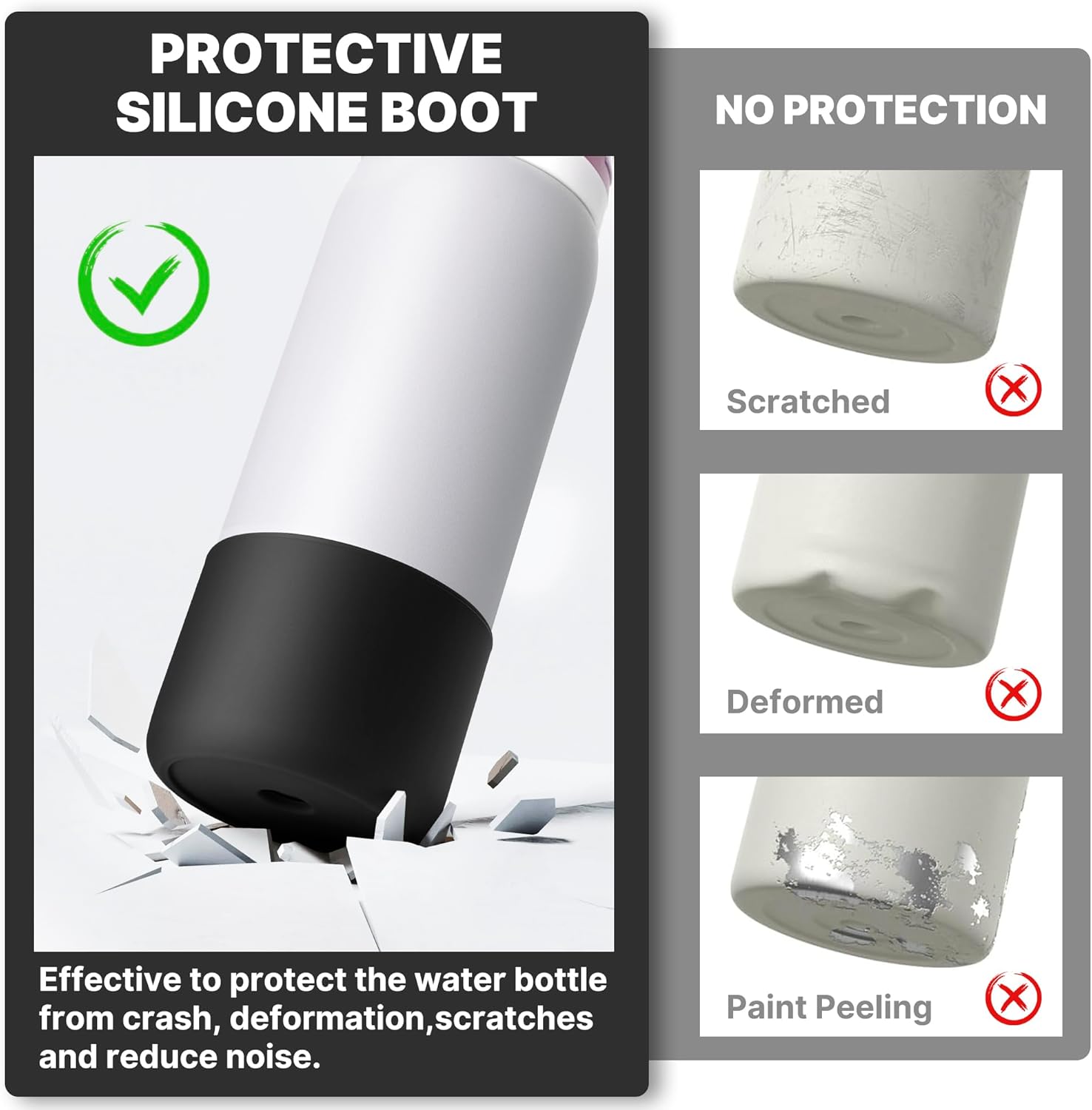- ALL-AROUND PROTECTION: Your expensive water bottle deserves the best protection. This silicone boot helps resist the wear and tear of everyday life, drops and fading, your water bottle will always look like brand new! No more embarrassing noises when placing your water bottle on your desktop.