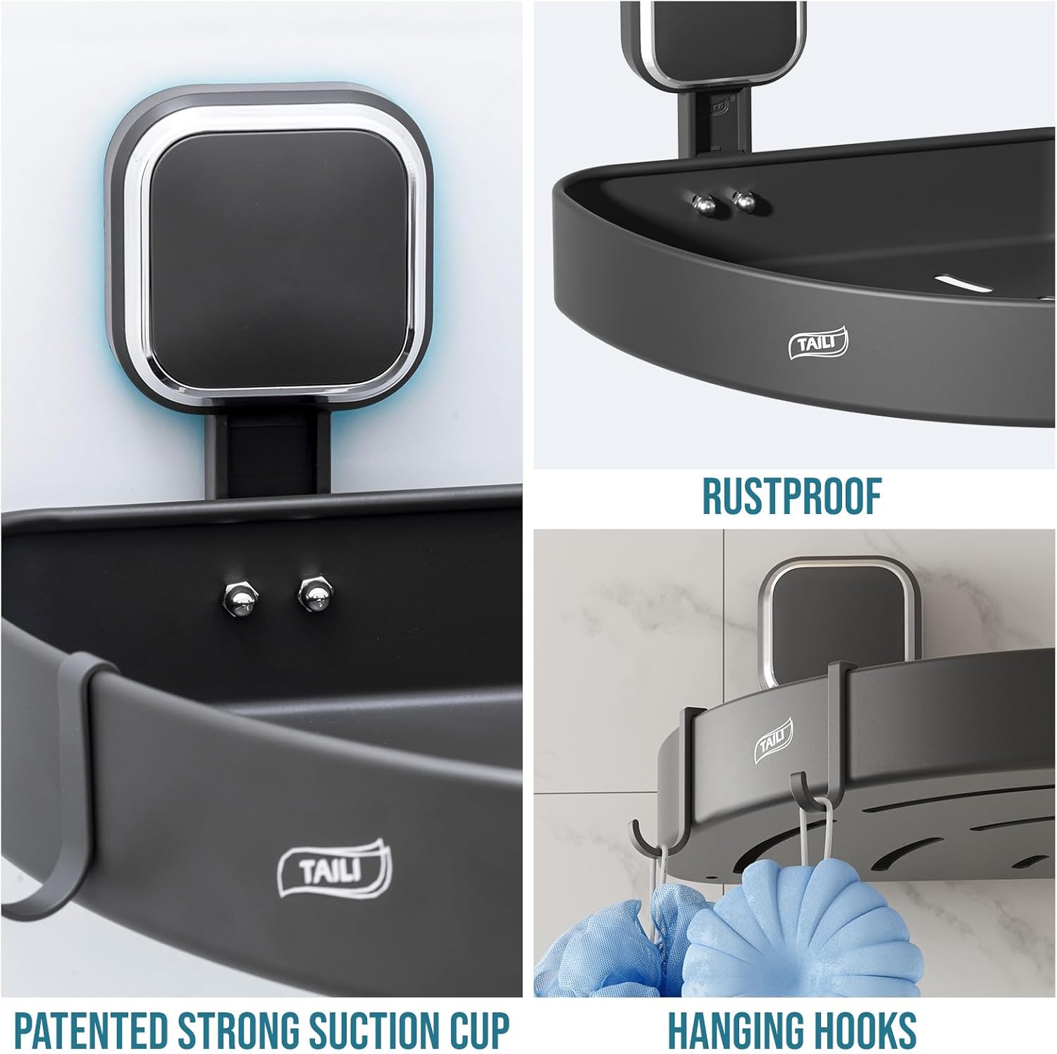 TAILI Corner Shower Caddy with Suction Cup Hooks, Aluminum Corner Shelf Basket, Wall Mounted Organizer Rack for Shampoo, No-Drilling Rustproof for Kitchen and Bathroom