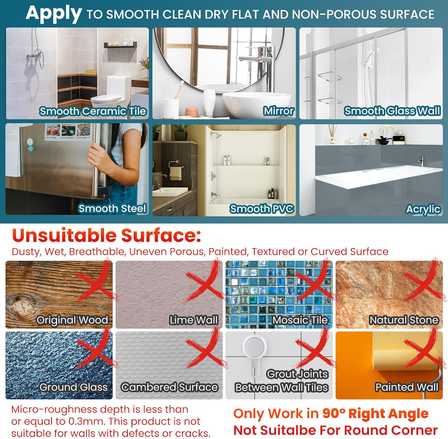 - WARM TIP : The corner shower shelves are only applicable for the corner 90°. There are three adhesive mountable snaps on each side of the basket, so you can choose the one that is away from the tile gap for installation. Adhesive not only works on smooth surfaces like metal, glass, tile, stainless steel,and acrylic,but also works on uneven tiles,cracked tiles and Latex paint wall.If any of the TAILI product did not meet your requirement