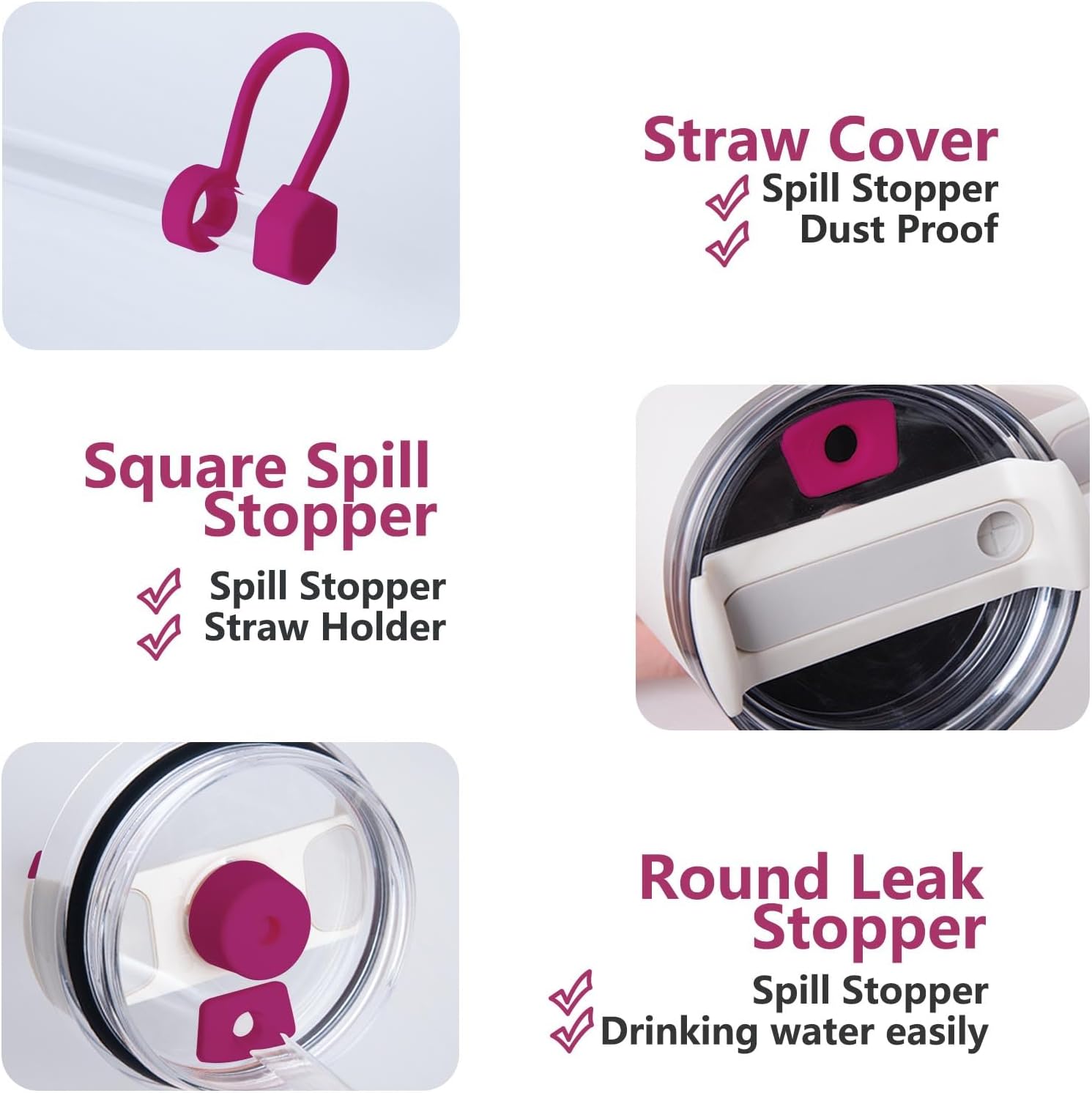 - 2 sets fuchsia leak proof stopper, each set contains 1* straw cover, 1* round lid leak stopper, 1* square spill stopper. Made of food-grade odorless silicone, compatible with Quencher H2.0 FlowState Tumbler 30oz & 40oz