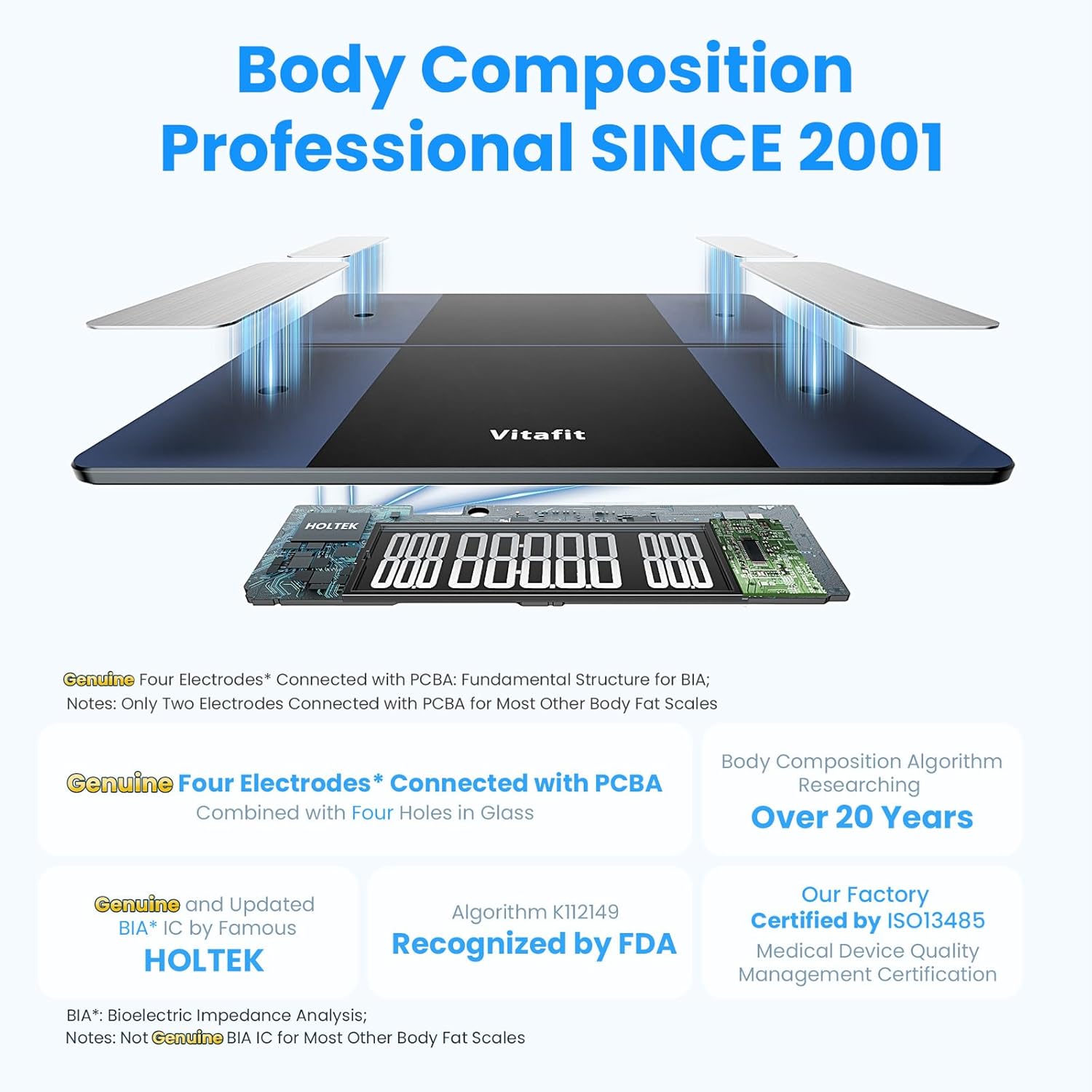 Vitafit 550lb Smart Bathroom Scale for Body Weight, High Precision in 0.1lb Assured by Weight Scale Professional Factory Since 2001, App Sync 13 Body Composition with BMI and Body Fat, Black