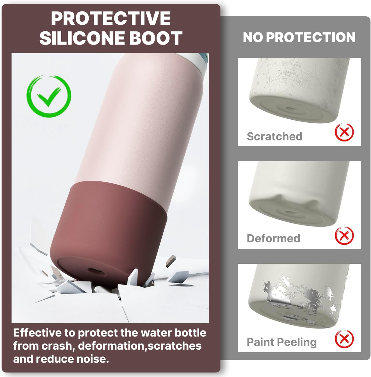 - ALL-AROUND PROTECTION: Your expensive water bottle deserves the best protection. This silicone boot helps resist the wear and tear of everyday life, drops and fading, your water bottle will always look like brand new! No more embarrassing noises when placing your water bottle on your desktop.