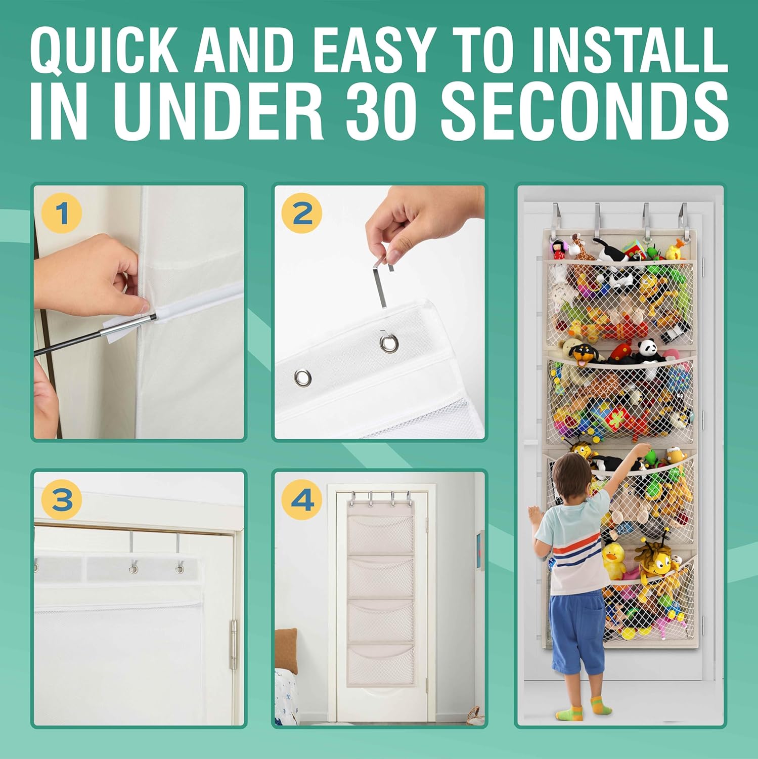 - 🧸 CONVENIENT STUFFED ANIMAL STORAGE - The perfect stuffed animal organizer to easily store and organize your favorite toys in our over the door storage unit. Easy to setup, durable, and allows kids convenient access to their toys. Equipped with breathable mesh pockets keeping your stuffies fresh and clean
